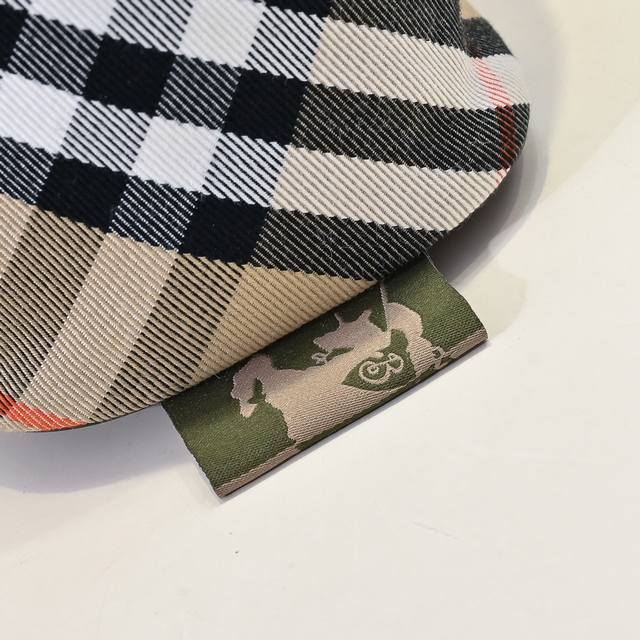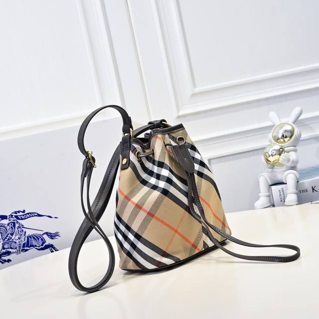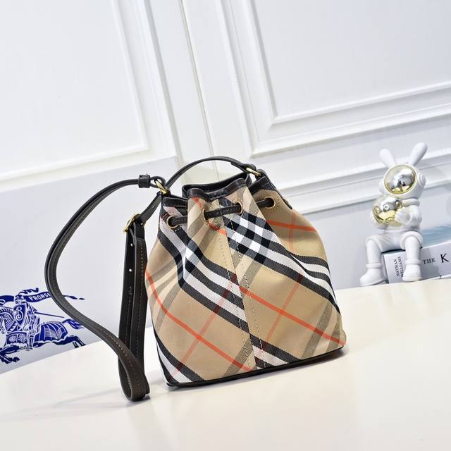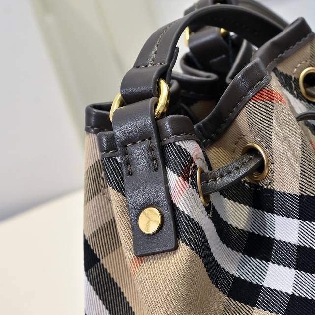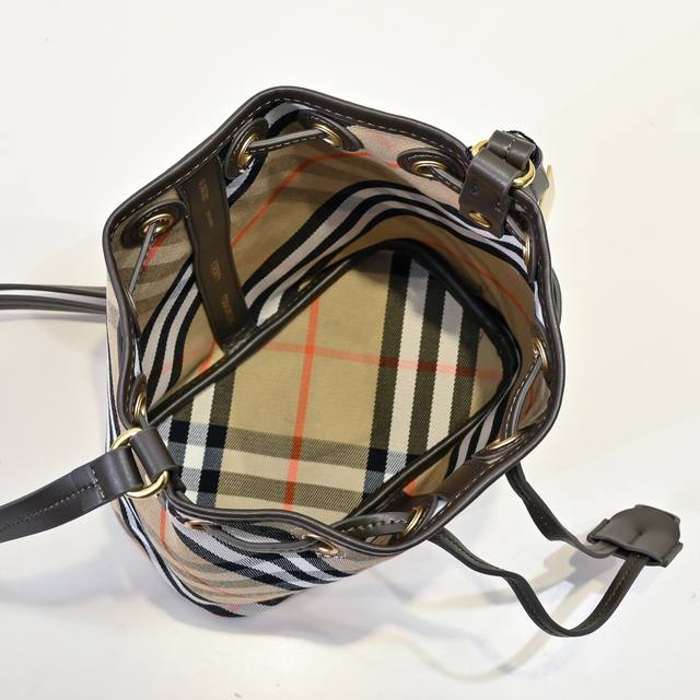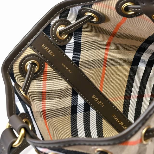 Beauty's latest mini bucket bag, crafted from cotton twill fabric. Handmade in the Italian workshop DDD, adorned with finely woven Burberry's signature check pattern. Unlined for a lightweight feel. Features smooth calfskin trim and an adjustable shoulder strap, allowing for versatile styling as a shoulder bag or crossbody bag. A must-have style. Dimensions: 17.5 x 10.5 x 20 cm. DDD Model Number 638387 DDD