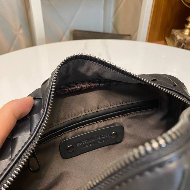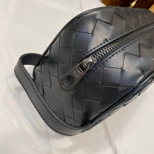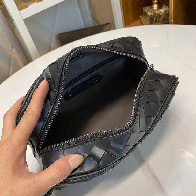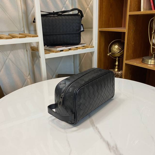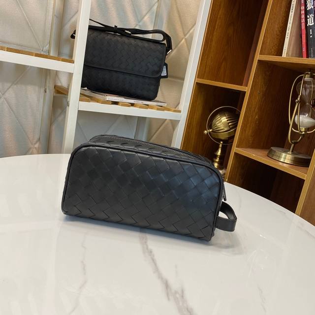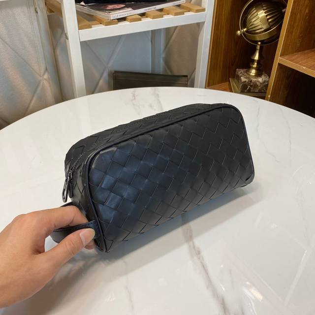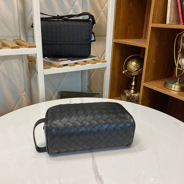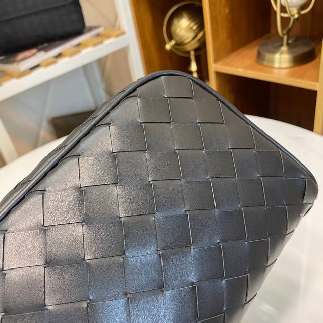 Bv pillow clutch is simple and handsome. Made of imported waxed cowhide, fully hand-woven with gray lining. Model: 7799#, color: black, size: 25X13X8Cm.
