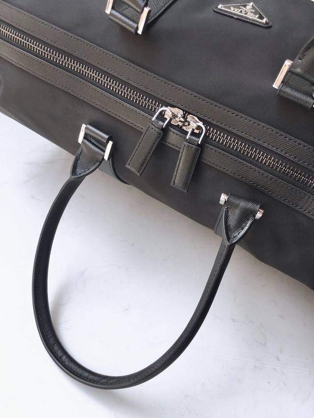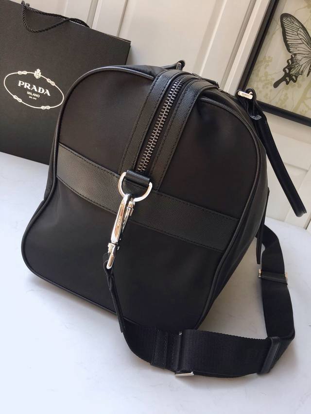 Classic Travel Bag 1V19S is made of imported parachute fabric and premium hardware. This classic travel bag features a modern design and a timeless classic. The bag is adorned with the iconic triangular metal logo. Lightweight and practical, it's a must-have for travel. Length 48cm x Height 26cm x Base 16.5cm
