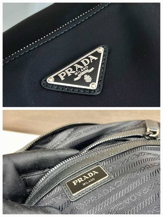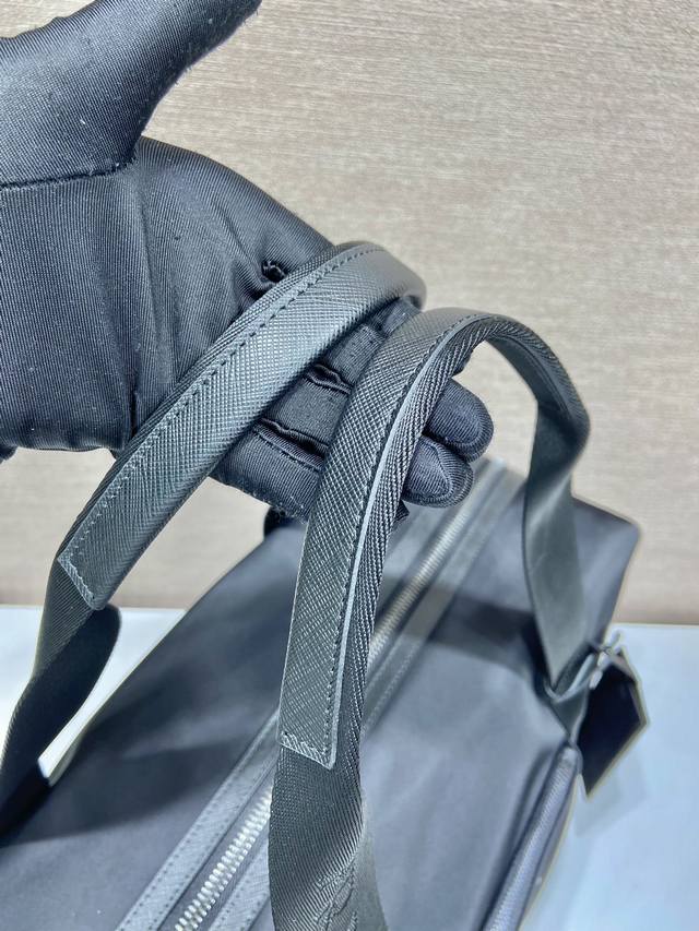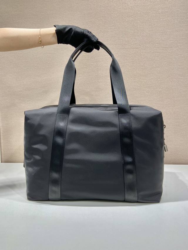 This travel bag is made of imported nylon and cross-grain cowhide with woven nylon handles.
