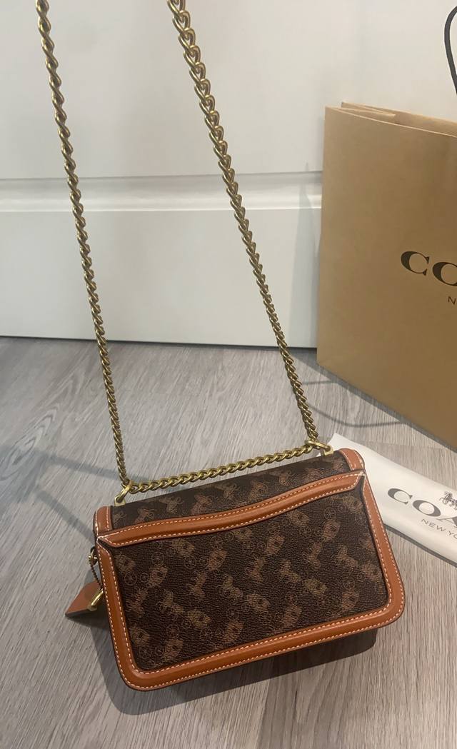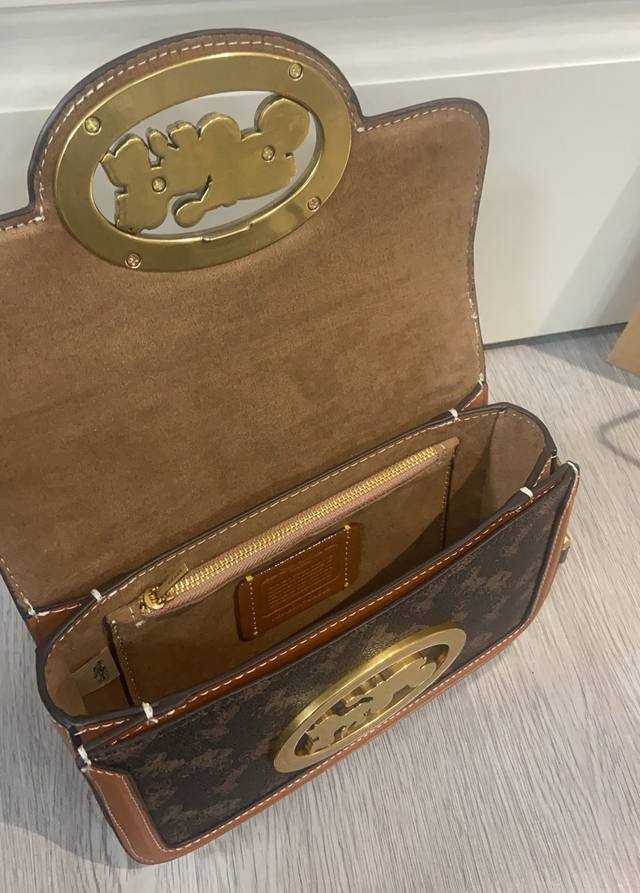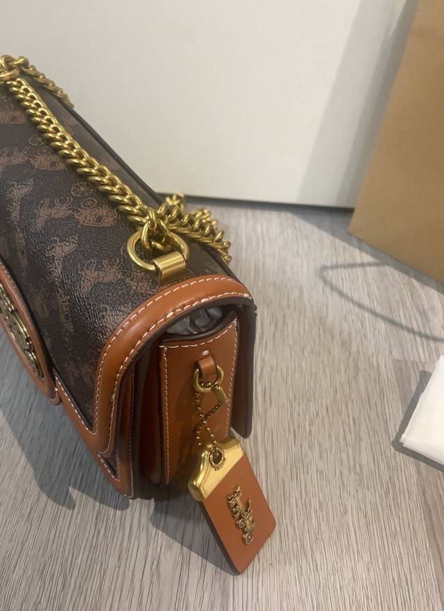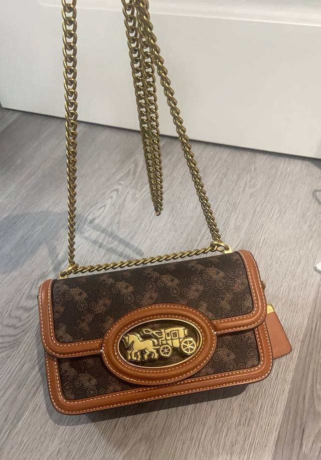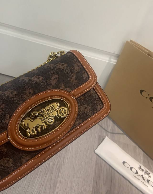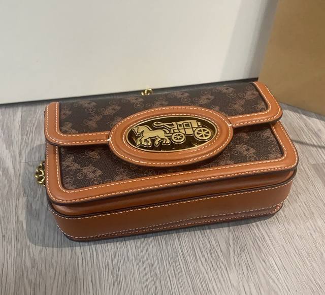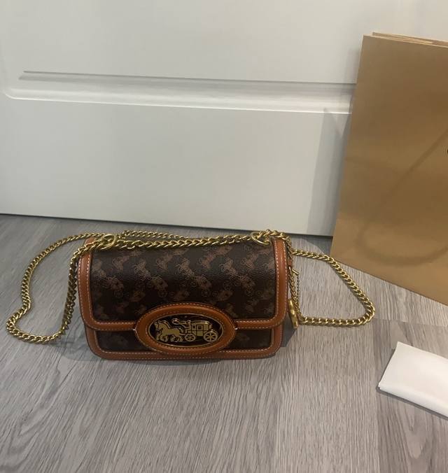 small bag draws inspiration from the classic horse-drawn carriage motif, seamlessly blending the brand's rich history with modern fashion. The bag's body is crafted from a blend of classic coated and cowhide leather, accented with refined metal hardware for a refined and durable feel. The carriage motif evokes the brand's signature elements while adding a touch of vintage elegance.