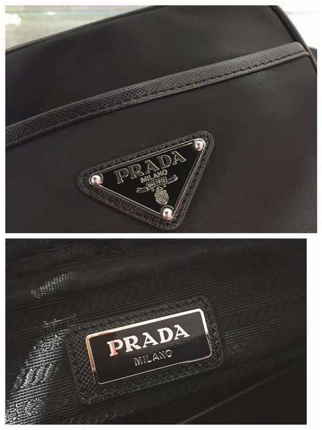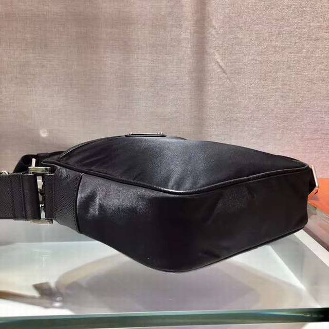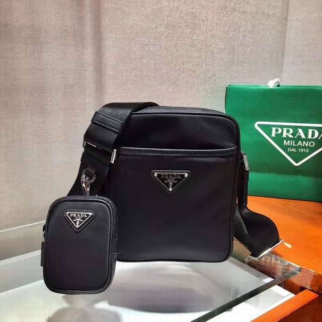 comes with a matching box, featuring the latest model from P! Model 2Vh112. This modern nylon crossbody bag features a detachable pouch charm and spacious interior compartments, making it highly functional. Saffiano leather trim enhances the design. Nylon hardware and titanium zipper, Prada logo, fabric lining, one main compartment with an interior pocket, exterior zipper pocket, detachable nylon pouch, jacquard logo accents, adjustable nylon shoulder strap, interior logo plaque, and triangular enamel logo on the front. 20 cm Height 16 cm Length 5 cm Width