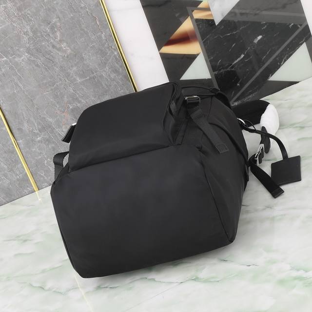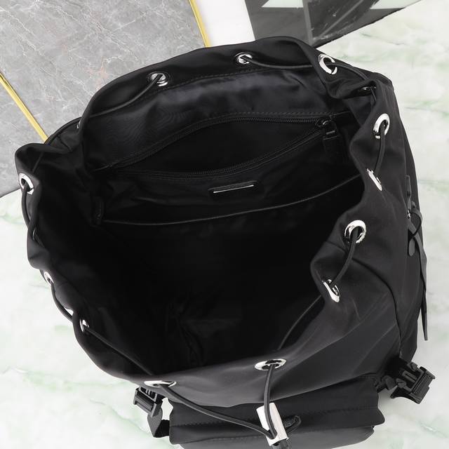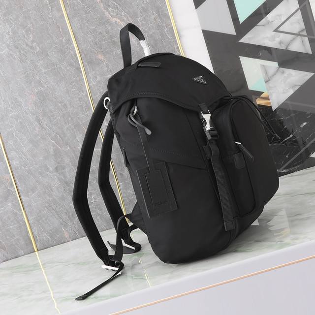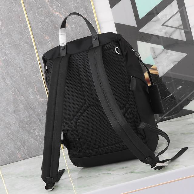 Exclusive First Look: 2Vz135 Backpack. This nylon backpack features Saffiano leather trim, crafted with creativity and technology to create a unique style. Multiple pockets and a technically padded back panel add a distinctive design element. A classic yet modern design, stylish and sophisticated, a timeless classic. Length 27 x Height 45 x Bottom 17 cm.