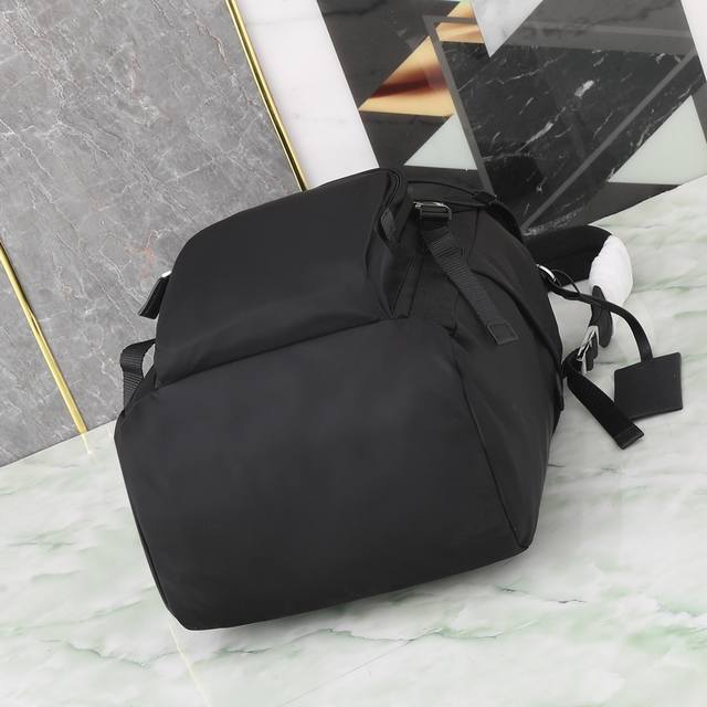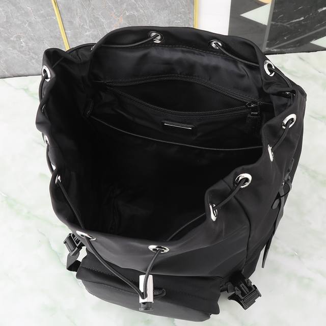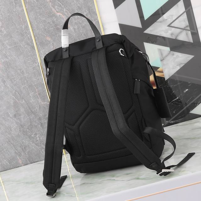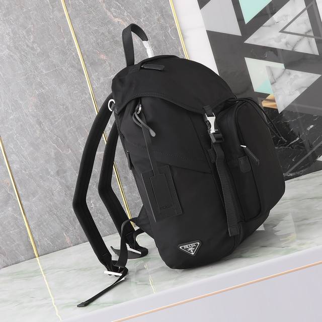 Exclusive First Look: 2Vz135 Backpack. This nylon backpack features Saffiano leather trim, crafted with creativity and technology to create a unique style. Multiple pockets and a technically padded back panel add a distinctive design element. A classic yet modern design, stylish and sophisticated , a timeless classic. Length 27 x Height 45 x Bottom 17 cm.