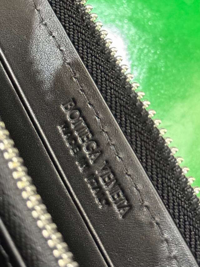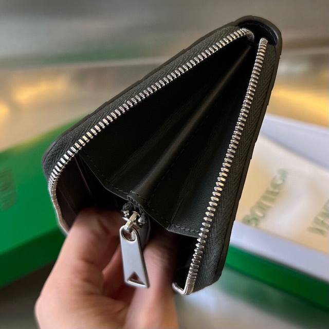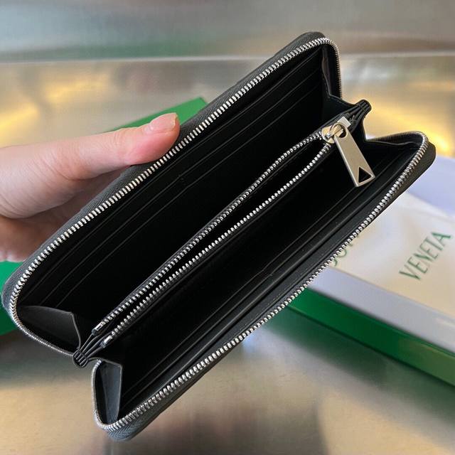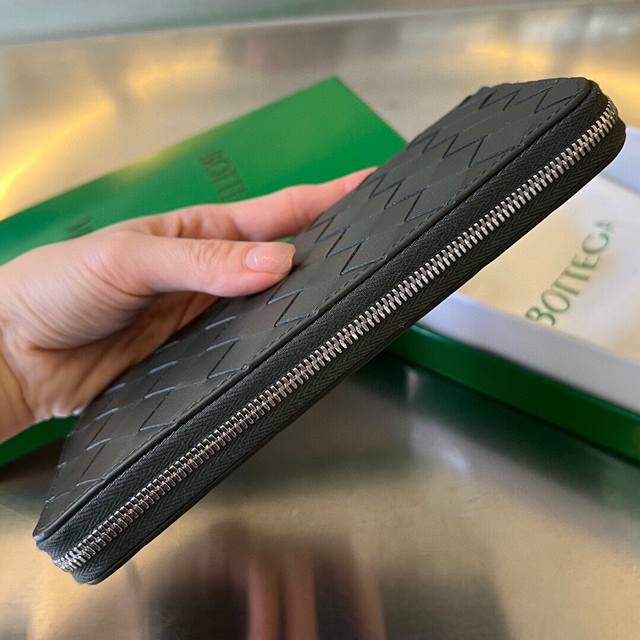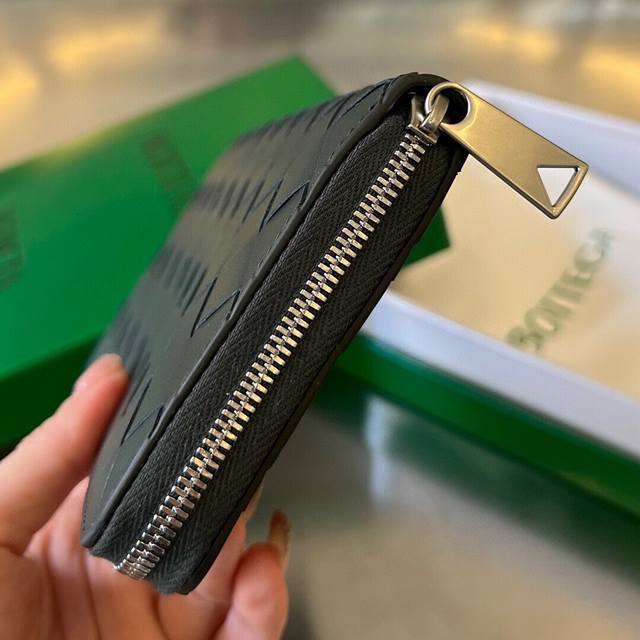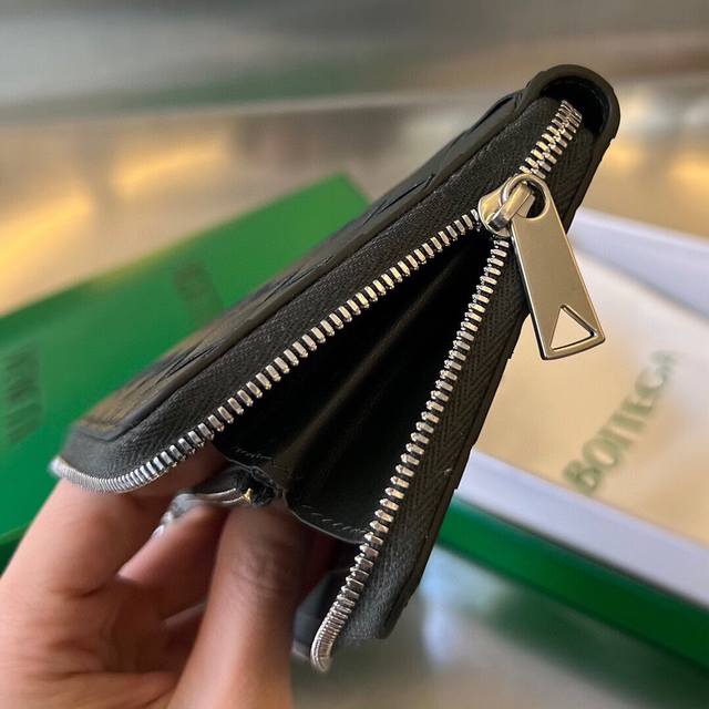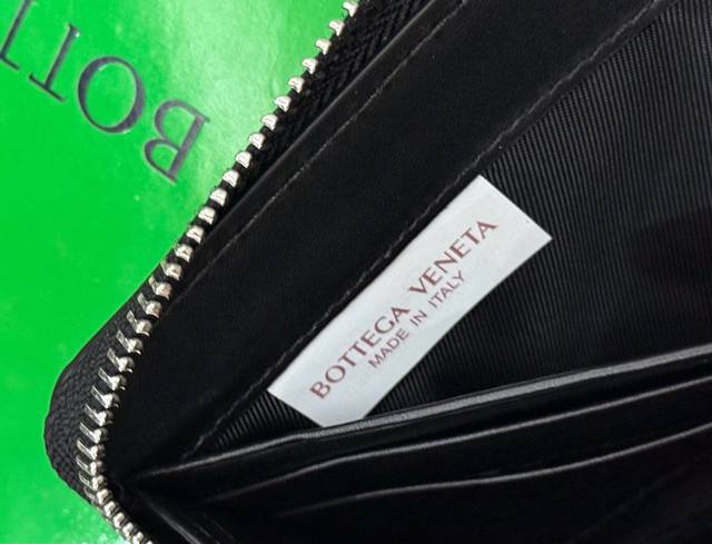 Genuine premium leather BV woven wraparound zipper wallet, black, 8 card slots, 2 bill compartments, 2 extra pockets, 1 zippered coin purse, zipper closure, genuine leather material, genuine leather lining, silver-finish zipper pull, dimensions 19 x 10 x 2 cm, model 742332 DDD