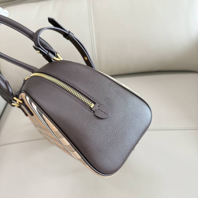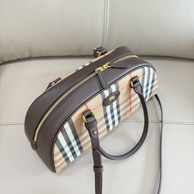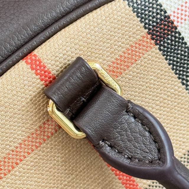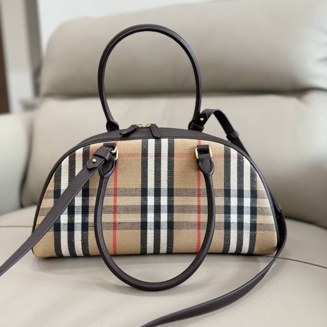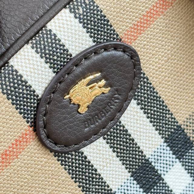 Highlands Bowling Bag (Ddd) This bag draws inspiration from outdoor design. Crafted in Italian workshops from a cotton-linen blend, it features smooth calfskin trim and a cotton lining. Adorned with Burberry's signature jacquard check pattern, it boasts a trench coat-inspired finish. A detachable shoulder strap allows for crossbody wear. It's embellished with the brand's equestrian emblem, a classic motif from 1980s bag collections. The front is decorated with the equestrian knight logo. Leather. Dimensions: 33.5 x 12.5 x 17 cm. Model: 2343.