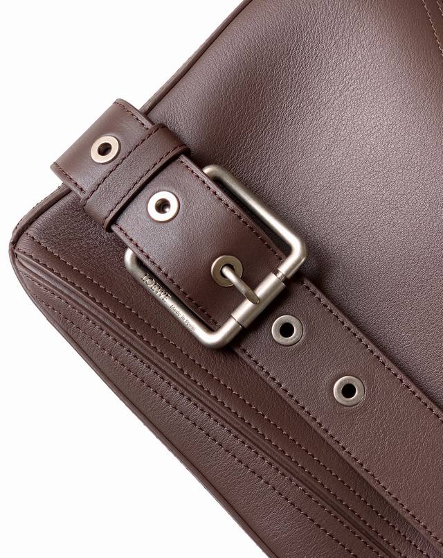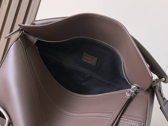 Large shiny cowhide leather puzzle Biker handbag. Distinctive geometric lines define the rectangular shape. This large version is crafted from shiny cowhide leather and embellished with motorcycle-inspired details. *Can be carried on the shoulder, crossbody, or by hand with a detachable, adjustable shoulder strap. *Zip closure with cowhide leather pull. *One exterior zippered back pocket and two interior slip pockets. *Rectangular metal feet. *Herringbone cotton canvas lining. Anagram 4