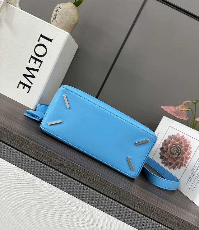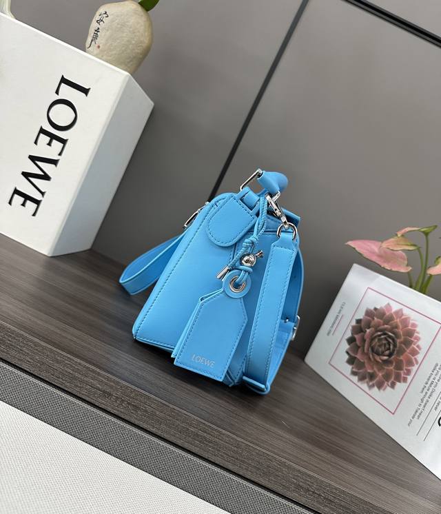 Low's new small Nappa lambskin Featherlight Puzzle handbag features a distinctive geometric rectangular shape. The soft, lightweight Nappa leather gives the bag a relaxed, effortless style. It can be worn over the shoulder, crossbody, or carried by hand. Features include a detachable and adjustable shoulder strap with a turn-lock clasp, a zip closure with a hinged zipper pull, an external zippered back pocket, an internal slip pocket, a detachable Loe**We gold or silver foil tag, a concealed pocket, and a balloon dice design. It also includes rectangular metal feet. The Nappa lambskin leather lining features Anagram embossing and a plaque engraved with "Loe**We." Model: 062502 Size : 24*10.5*16.5cm