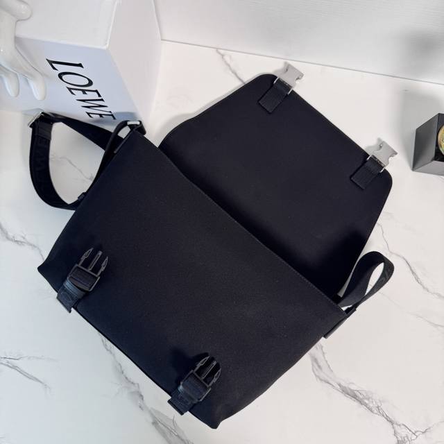 Lw High-quality all-steel hardware new medium-sized canvas and suede Flex messenger bag with trapezoidal flap design and exquisite sporty details. This medium version is made of cotton twill canvas and suede. * Fits a 13-inch laptop * Can be worn on the shoulder or crossbody * Adjustable Loewe webbing * Snap flap * One zippered front pocket, one magnetic snap rear pocket * One zippered interior pocket * Nylon lining * Anagram embossing with D-ring. Model: 822513 All-steel hardware DDD