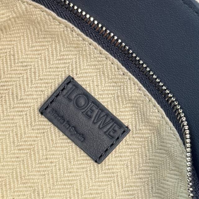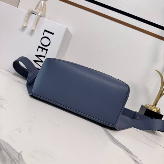*The rectangular shape and precise cutting techniques create the puzzle's distinctive geometric lines. This small waist bag is crafted from classic cowhide leather with overlapping edges. Carry it on the shoulder or crossbody. *Adjustable shoulder strap with metal buckle closure and engraved Loew logo. *Zip closure with cowhide zipper pull. *Exterior zipper pocket and interior slip pocket. *One exterior zipper pocket. *Herringbone cotton canvas lining. *Anagram embossed.