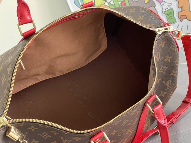 M44 Lu Keepall 50cm Travel Bag, this Keepall is a classic among travel bags. This large Keepall is crafted from Monogram canvas with a detachable leather shoulder strap and a detachable leather ID holder. - Specially coated canvas - Natural cowhide trim - Cotton textile lining - Removable shoulder strap with padded shoulders - Leather handles for comfortable carrying - Large capacity - Carry-on size - Removable leather name tag - Gold metal hardware - Size 50*21*28cm