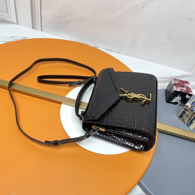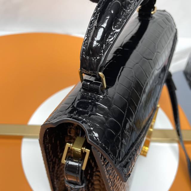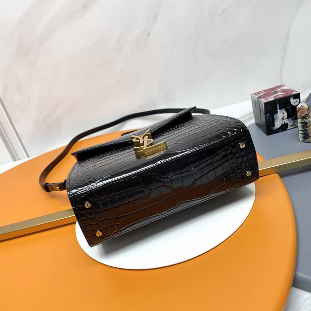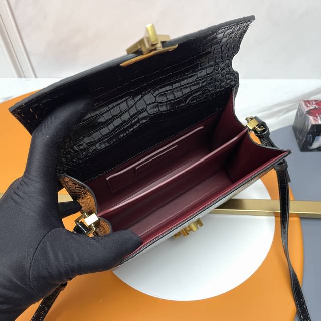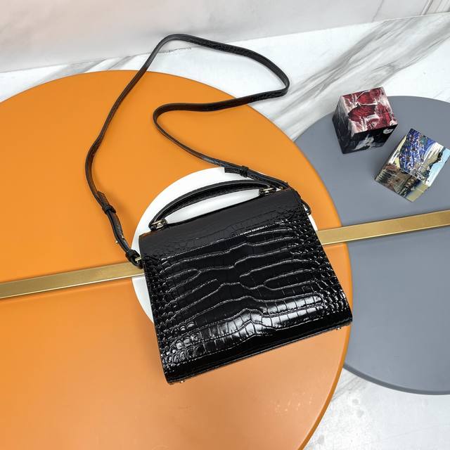 crocodile-print handbag! This series's unique design features a rotating metal clasp, a workmanship of exceptional complexity. The interior features two spacious inner pockets and a card slot, along with an open back pocket. The small size of this bag holds considerable capacity. The adjustable shoulder strap, paired with a handle, allows for easy carry or carry. This stylish bag is sure to impress!