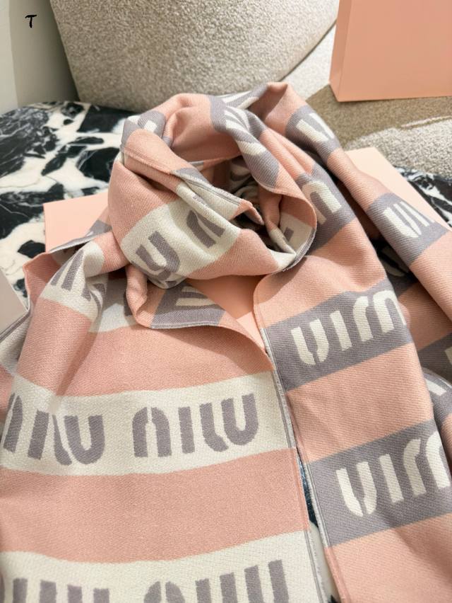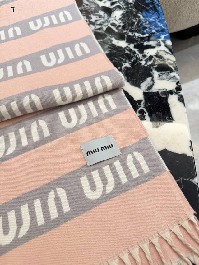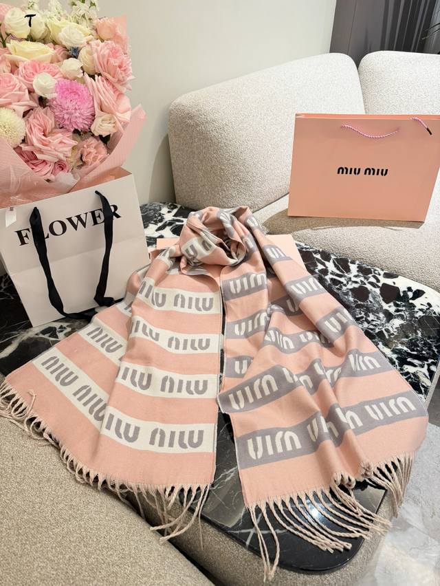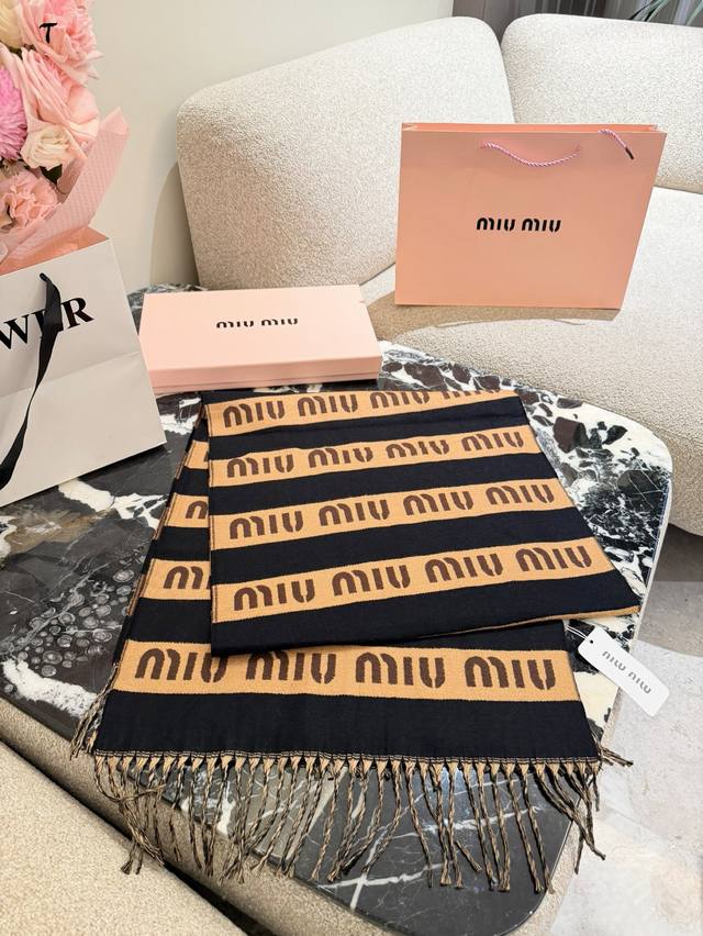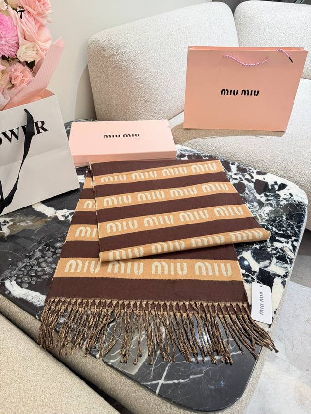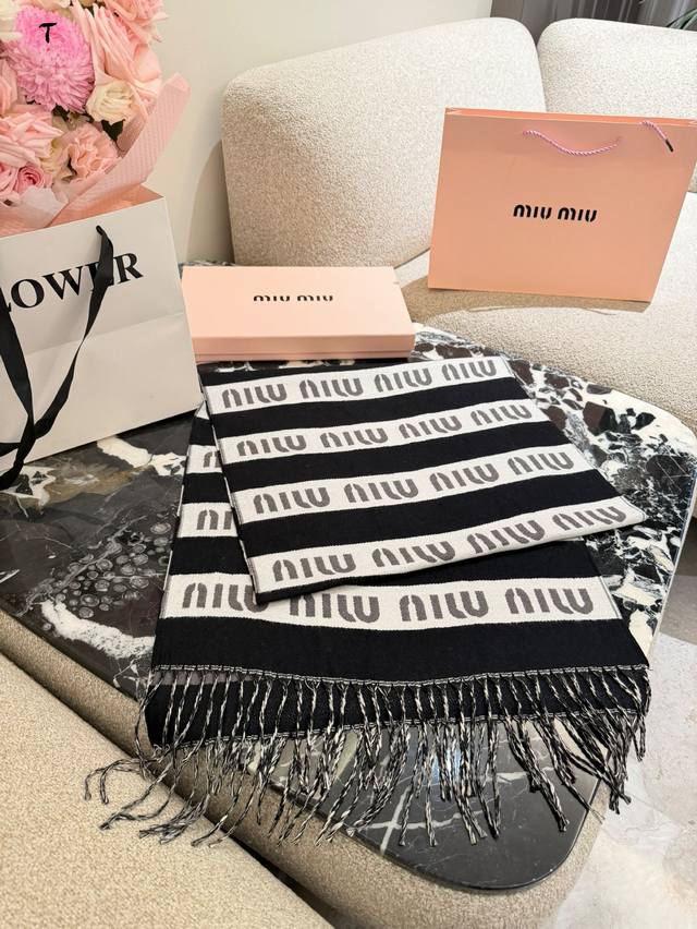Miumiu patchwork tassel scarf. The overall design incorporates various geometric patterns. The main body features varying shades of gray-black stripes, edged with irregular geometric prints. The material is likely a wool or cashmere blend, with a soft texture. The tassels at both ends are its signature decorative element. It's suitable as a stylish accessory in autumn and winter, paired with a coat or sweater to add layers and warmth to the look. It can be used as a neck scarf or shawl. Comes with packaging.