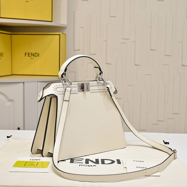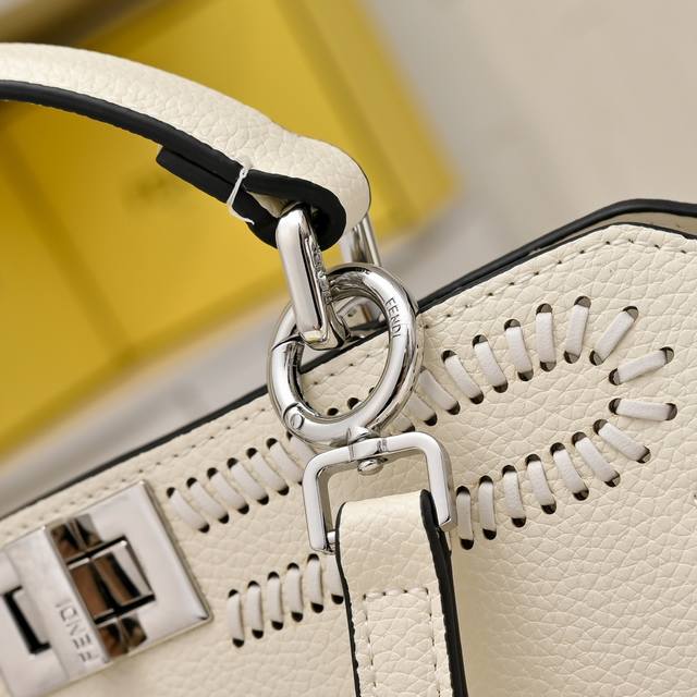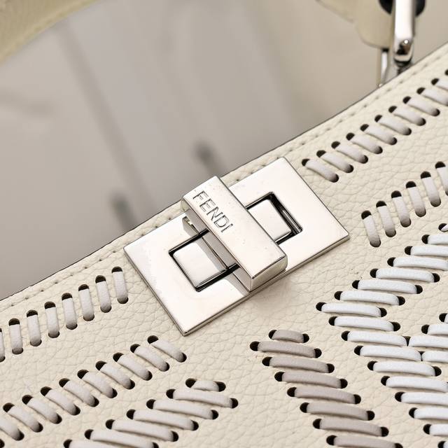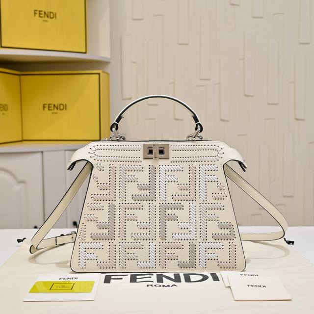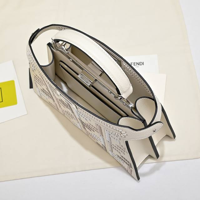 The iconic medium Baguette handbag is made of jacquard Ff pattern fabric and embellished with over 350 artificial crystals and rhinestones. It is decorated with an Ff buckle. It features a front flap, a magnetic clasp, an interior compartment with a zip pocket, and silver-tone hardware. The handbag comes with a detachable leather handle and shoulder strap, allowing it to be carried by hand, on the shoulder, or across the body.