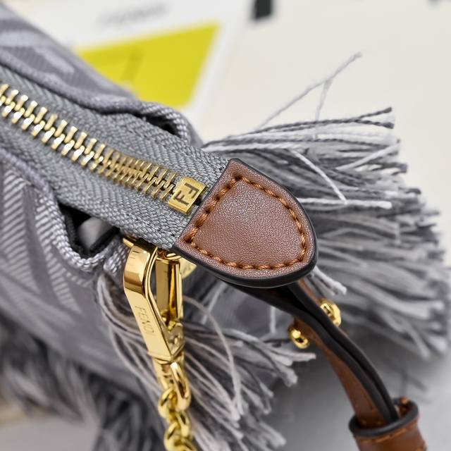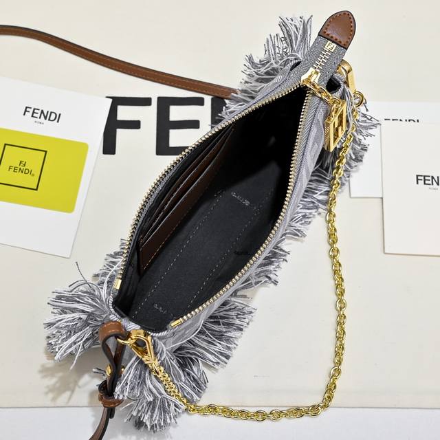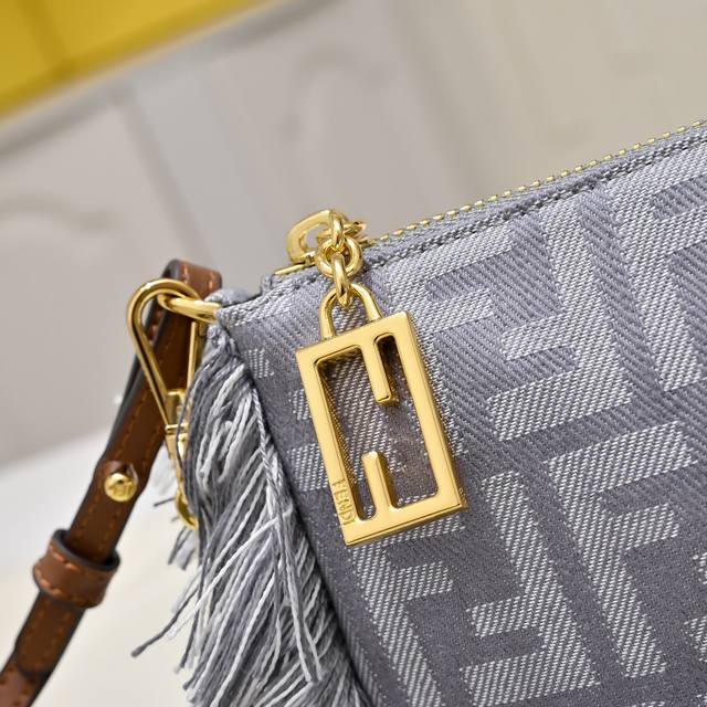 Model 7717 Baguette clutch, denim jacquard material with classic double F Logo, and tassel design, with detachable thin chain and long shoulder strap, zipper closure, zipper head decorated with iconic Ff pattern, small and exquisite, easy to hold daily small items, can be held in hand or under the arm and crossbody