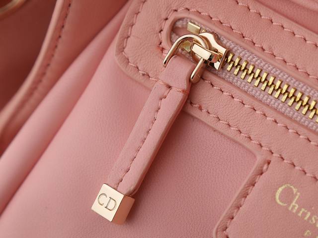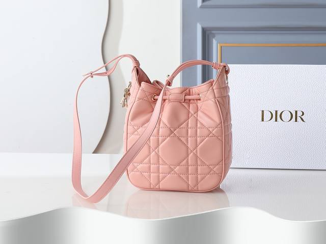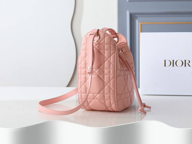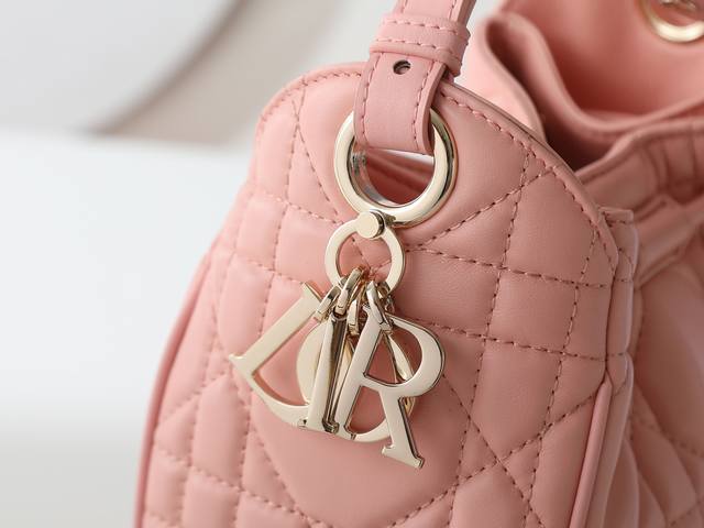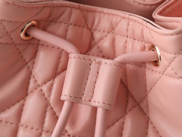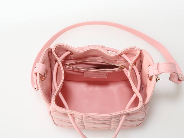 Model No. 2851 Sheepskin Pink Small D-Motion Handbag, stylish and practical bucket design, made of sheepskin with oversized rattan check stitching, soft version with drawstring closure. Size: 19.5cm-17cm-11cm