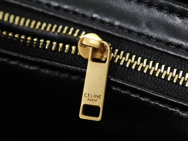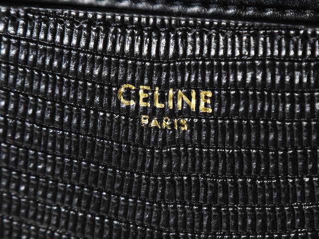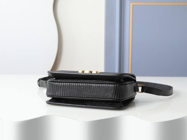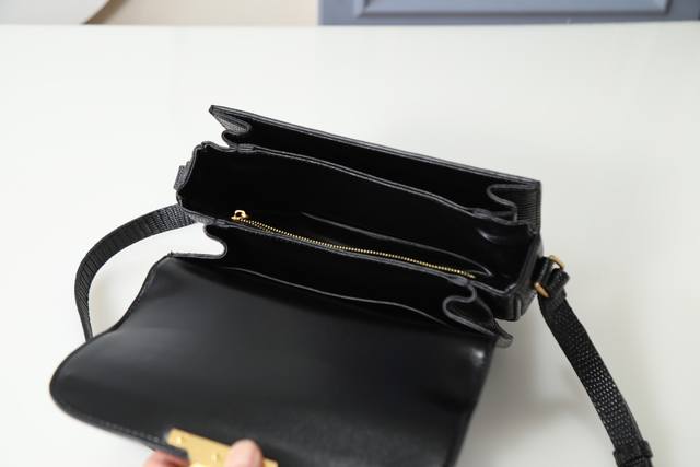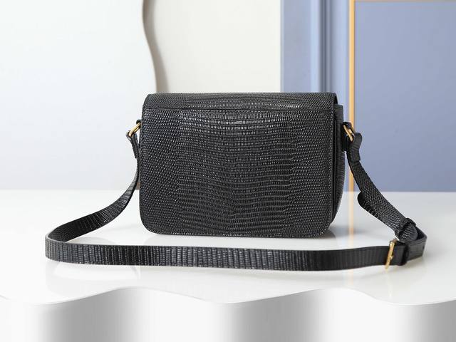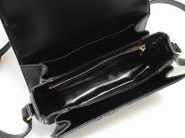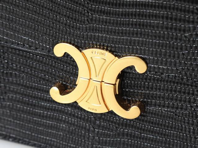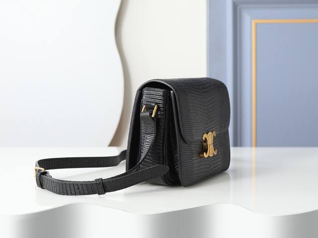 Model No. C188411 Black lizard pattern Triomphe large handbag with an adjustable and detachable leather shoulder strap and a brass tower buckle. Gold metal hardware and brass lock buckle for crossbody and shoulder carry. Dimensions 22.5cm x 16.5cm x 7.5cm