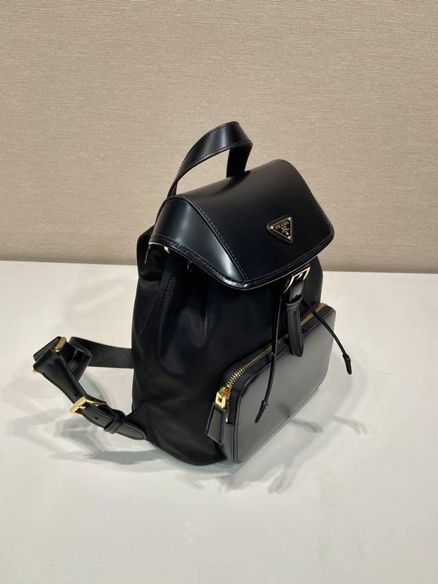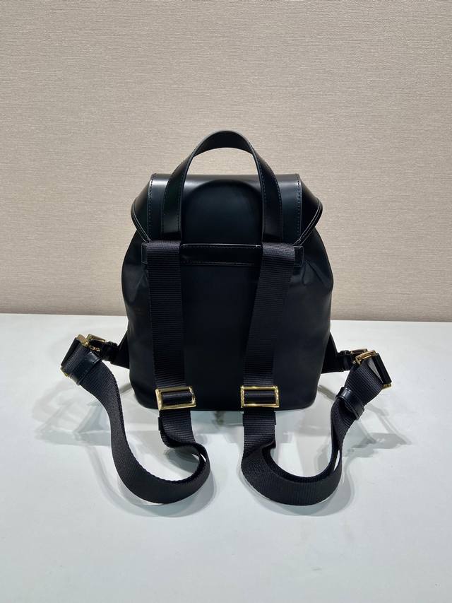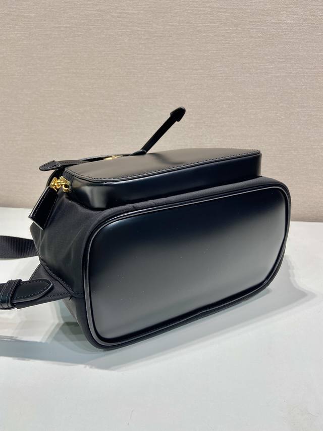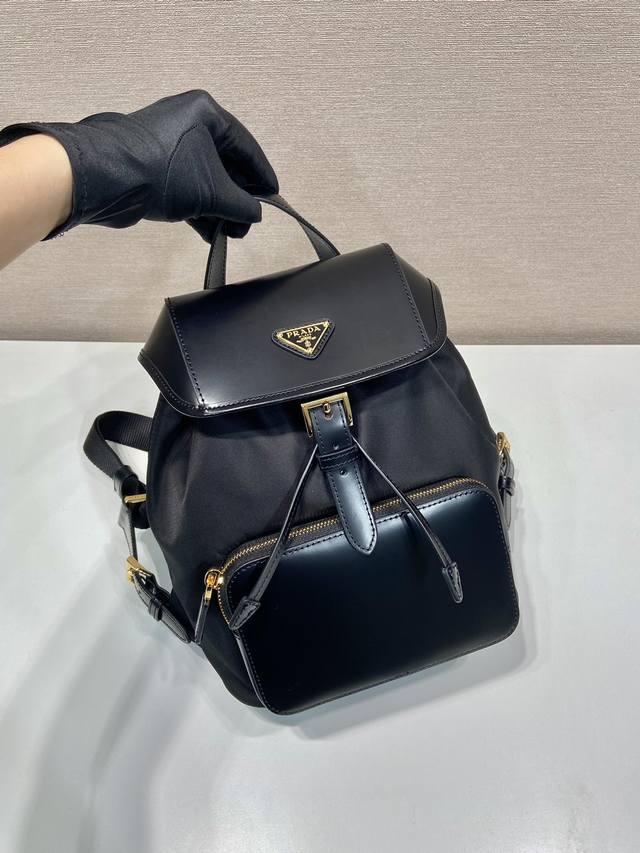 This backpack combines several elements, featuring imported nylon fabric, glossy cowhide, and top-quality metal hardware. Elegant and versatile, it includes an exterior zip pocket and is adorned with the iconic enamel triangular metal logo. Another timeless backpack. Ladies, grab one now!