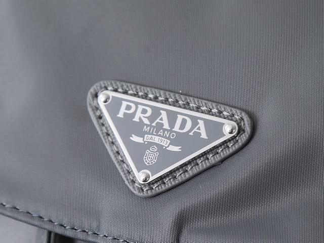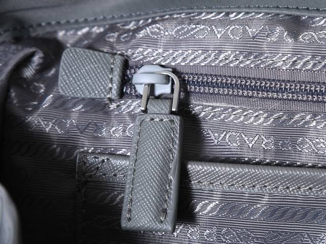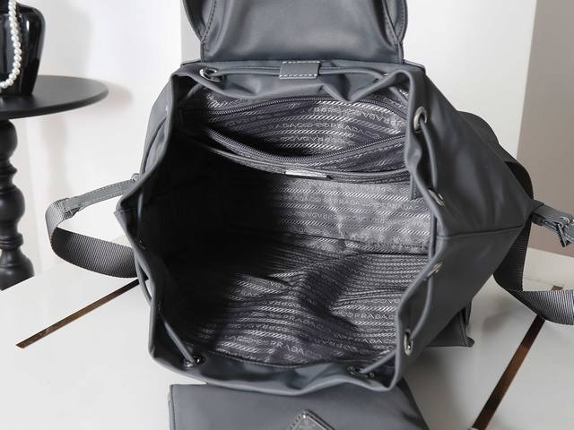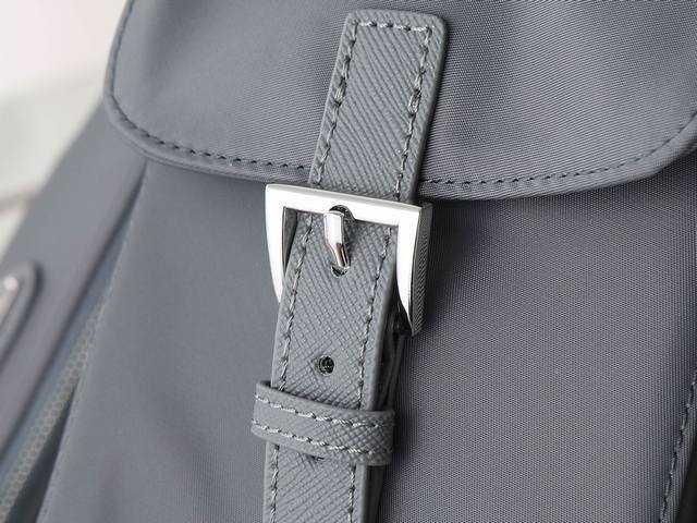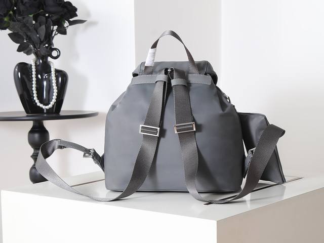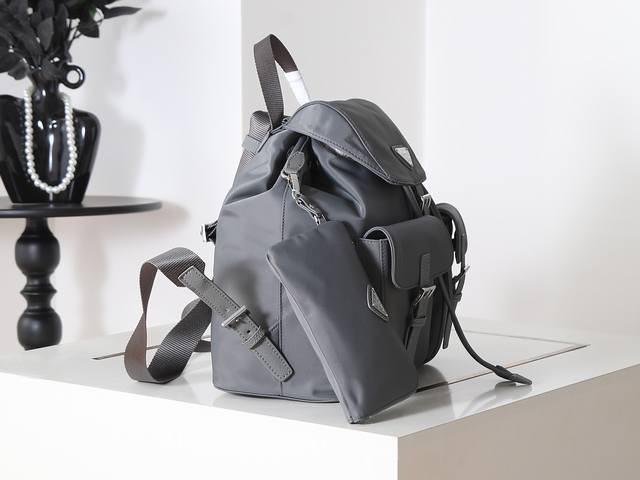 New Backpack 1Bz811 Mercury Grey. This nylon backpack features exquisite Saffiano leather trim, blending multiple materials and adorned with a triangular logo, showcasing fashionable and elegant charm. It also comes with a detachable small pouch that is lightweight and practical, creating a stylish and versatile look. The upgraded nylon fabric measures 30cm (L) x 32cm (H) x 15cm (D).