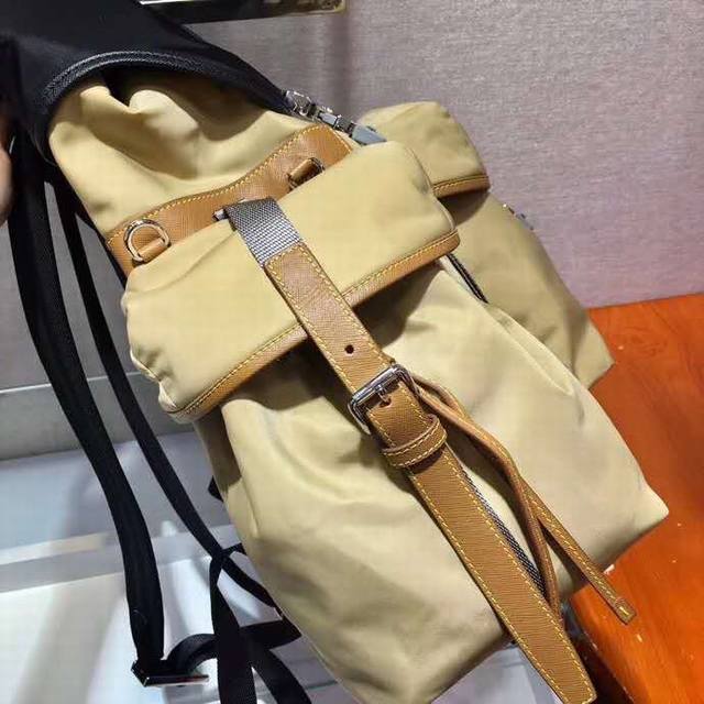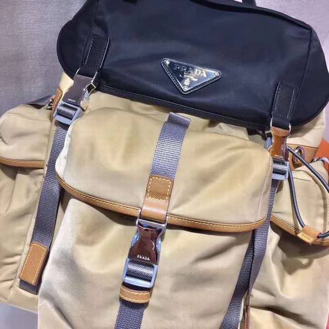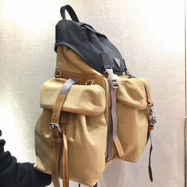 New Backpack 2Vz074 DDD Made of fabric with Saffiano leather trim, this backpack features a design that combines functionality and modern style. It boasts multiple pockets, contrasting colors, and striking materials that make it eye-catching and spacious. The overall look is incredibly stylish and sophisticated. The intricate handcrafting and exquisite workmanship make it a must-have for men. DDD Length 37cm, Height 42cm x Bottom 17cm DDD