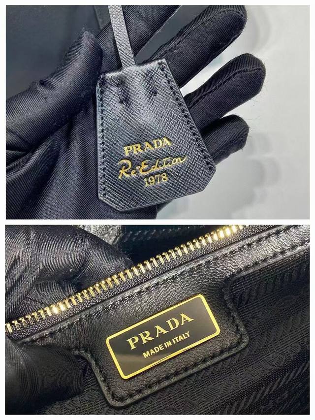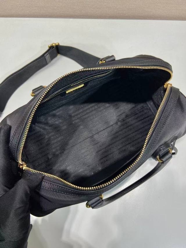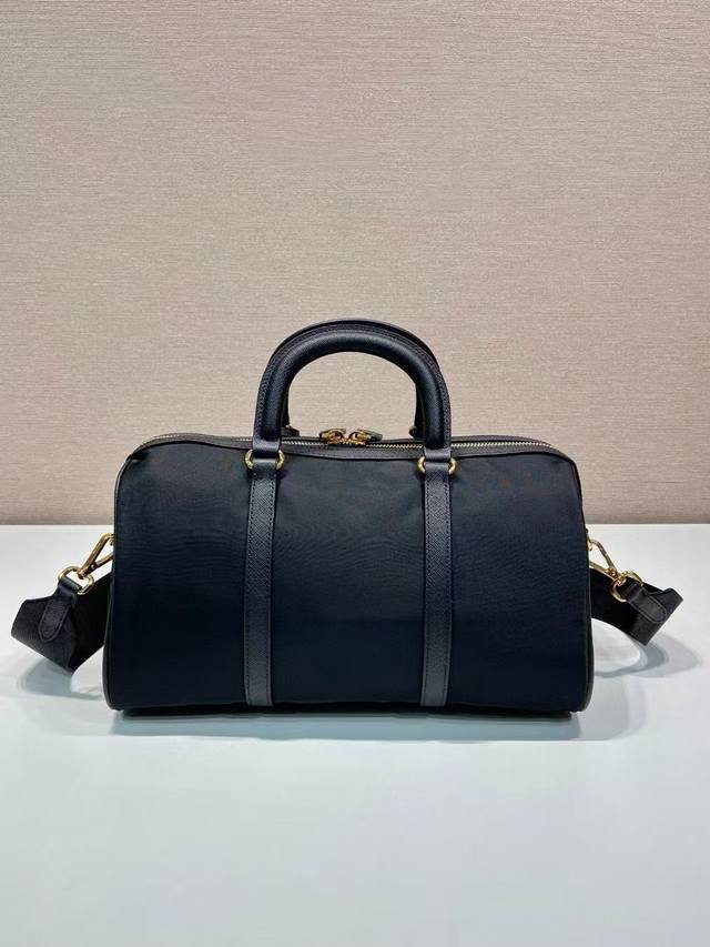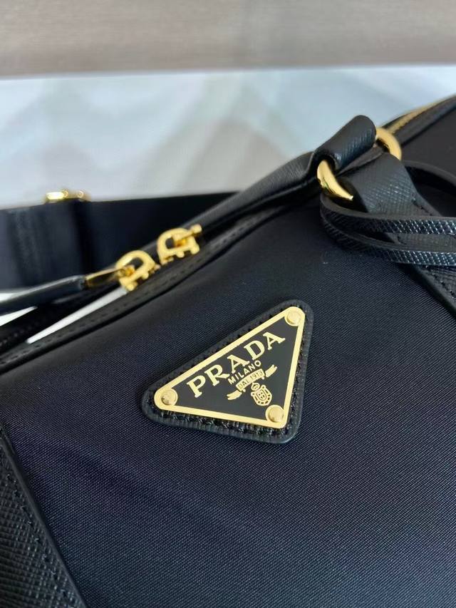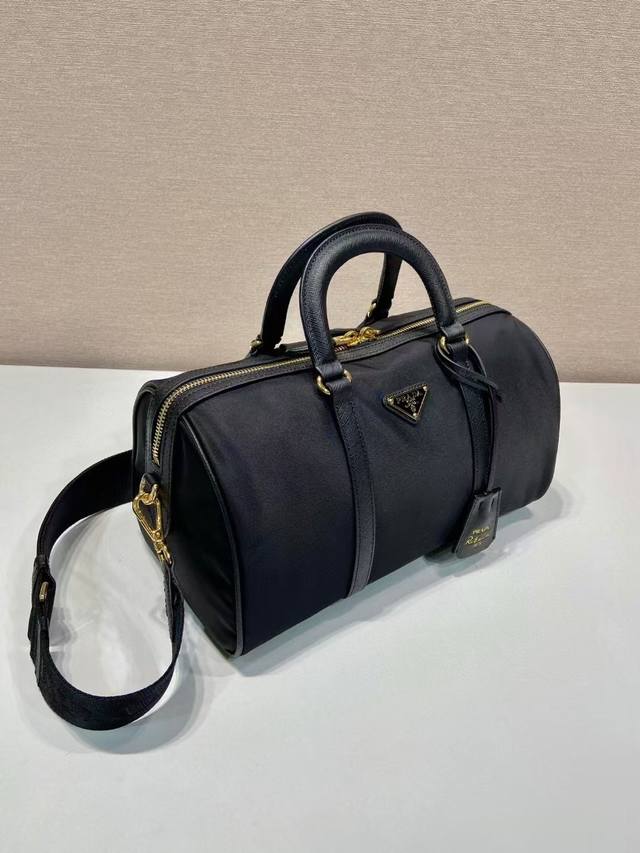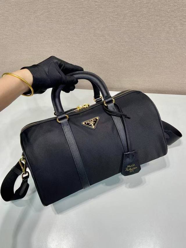 This handbag is crafted from innovative sustainable recycled nylon fabric Re-Nylon, featuring a structured design and elegant details such as Saffiano leather and metal hardware. Refined and practical, it's adorned with an enamel triangular metal logo. It comes with a detachable and adjustable long shoulder strap. Spacious and stylish, this handbag is a must-have for any fashionista!
