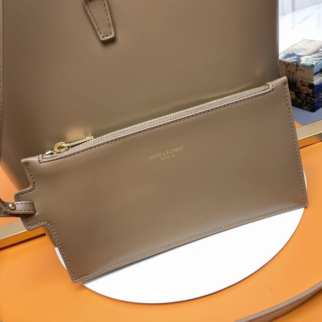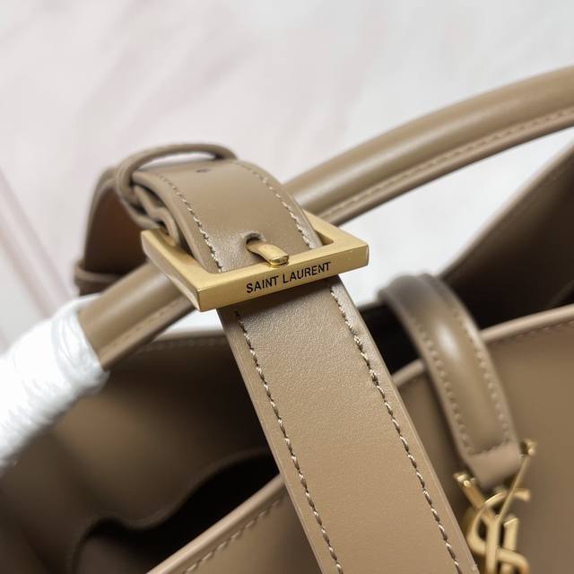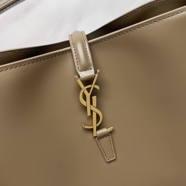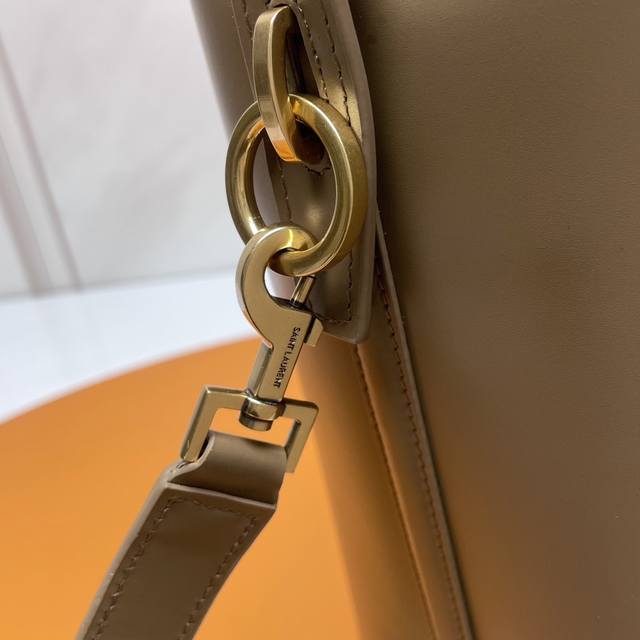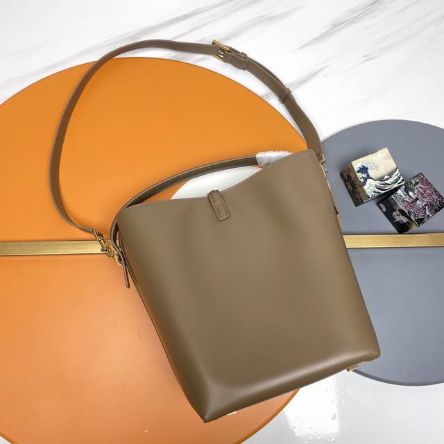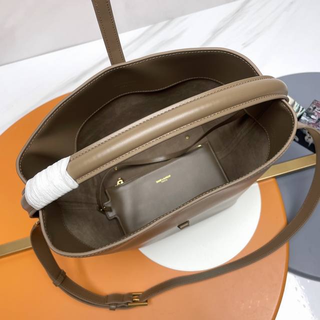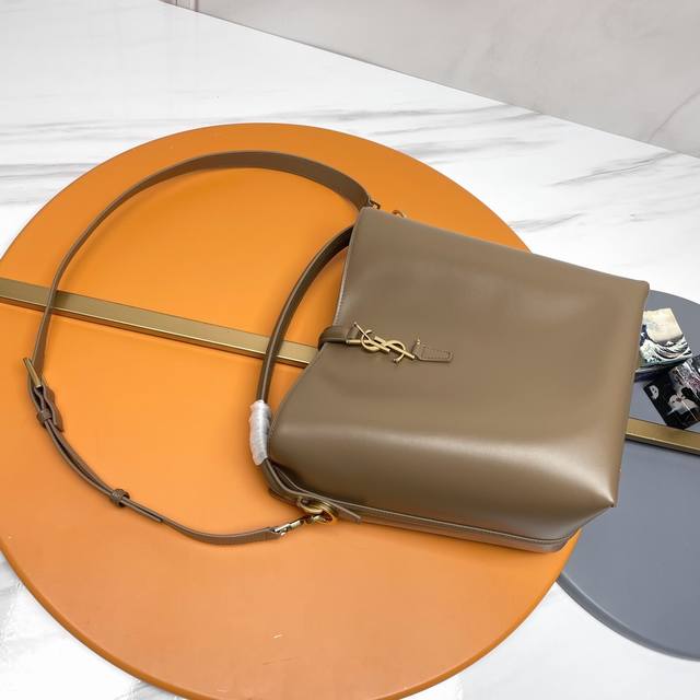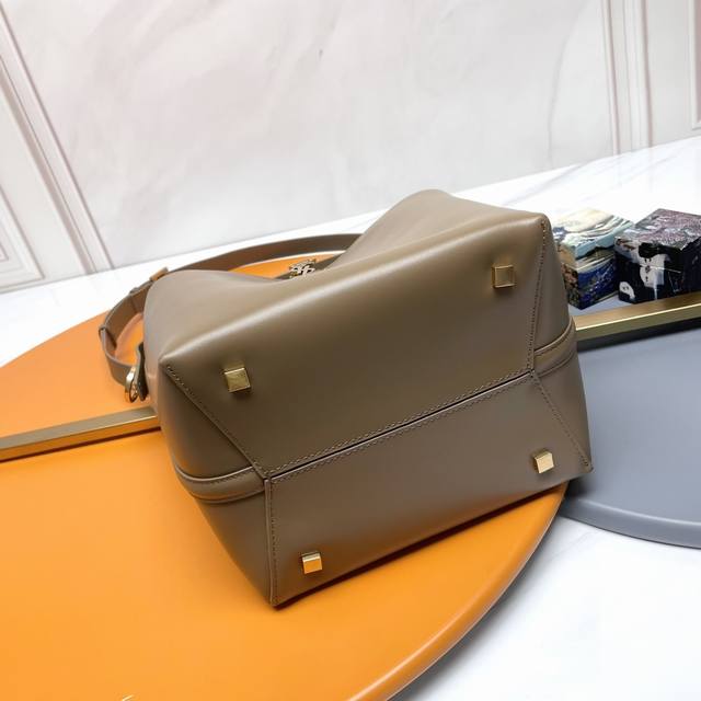A new, stunning bucket bag with a top handle. This brand-new bag is crafted from Italian calfskin leather, creating a simple, three-dimensional silhouette that looks stiff without being too harsh. The bag features four metal feet at the bottom and a snap-on clasp with the iconic metal logo, creating a unique, classic, yet stylish and modern look.