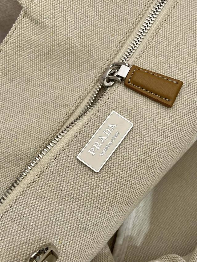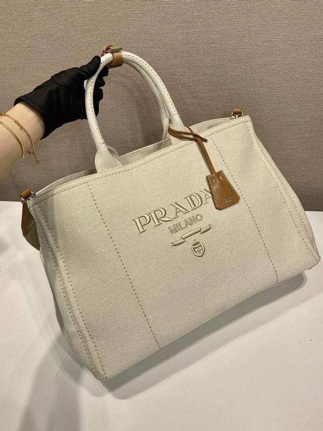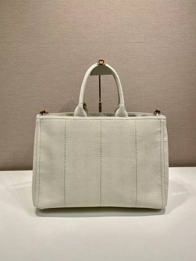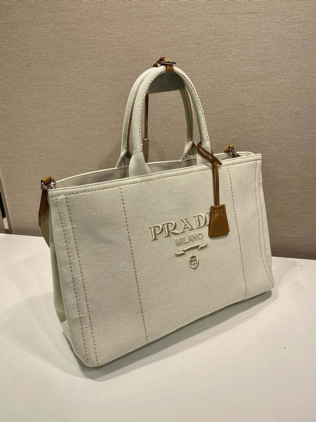 This canvas handbag offers a fresh take on a simple, sophisticated design, versatile and spacious. Its classic silhouette is accented with leather trims, showcasing the essence of exquisite craftsmanship. It features striking stitching, canvas handles