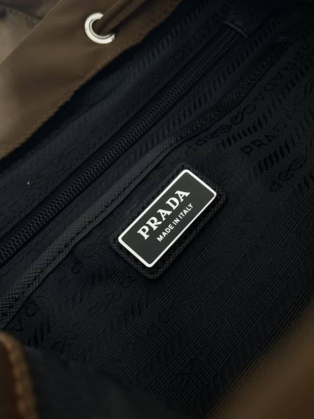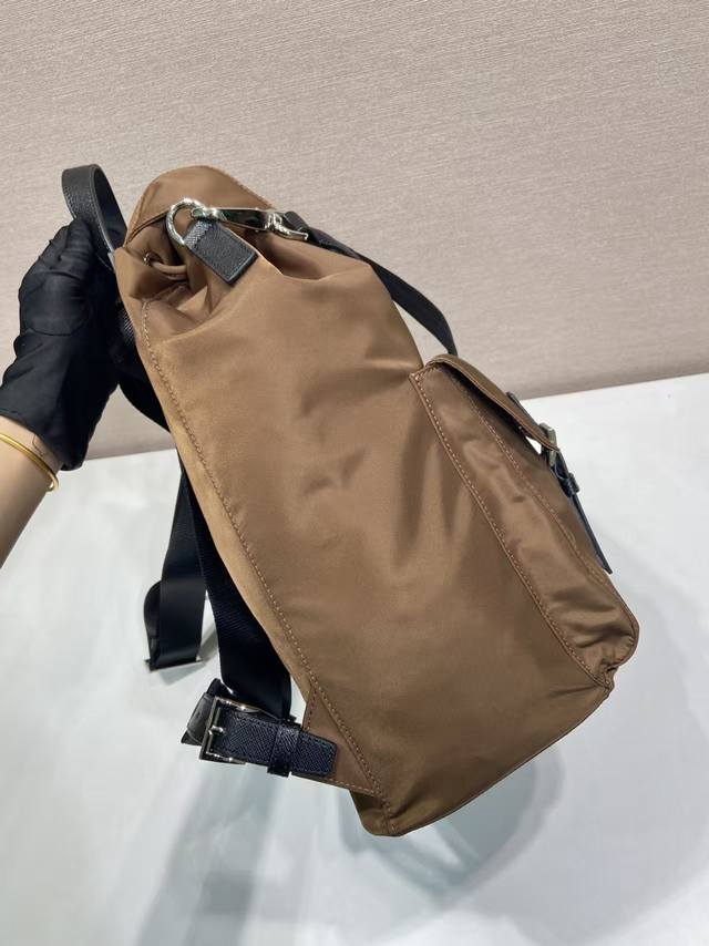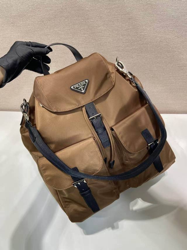 New Re-Nylon Backpack 2Vz110A, Gold/Brown Color. This Re-Nylon backpack features classic nylon fabric, top-quality hardware, and innovative yet practical elements, presenting a refined and timeless style. It comes with a detachable shoulder strap, making it versatile for different occasions. It looks very stylish and sophisticated, another timeless and popular item