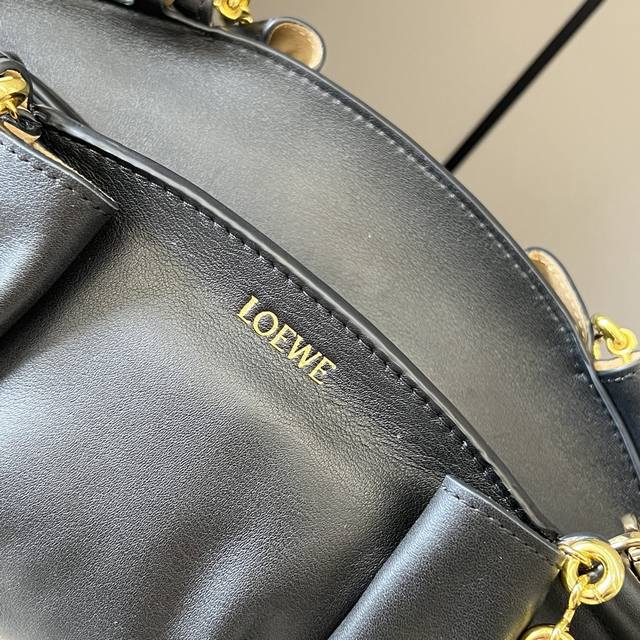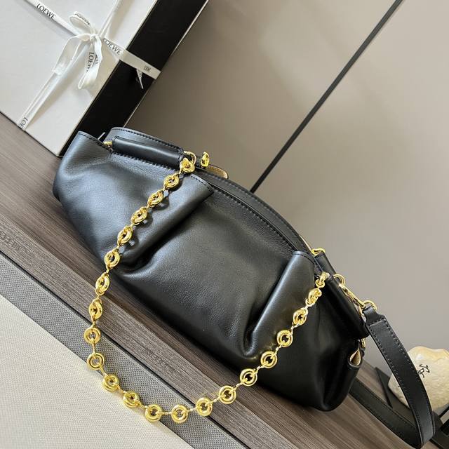 Exquisite workmanship, simple and elegant silhouette, brings a unique pleated structure that is soft and ultra-light. This chain handle version is made of shiny Nappa leather and comes with an additional leather strap. Hand-held or shoulder-carrying * Removable and adjustable leather shoulder strap * Invisible zipper on top * Gold suede lining * Loe * We hot stamping.