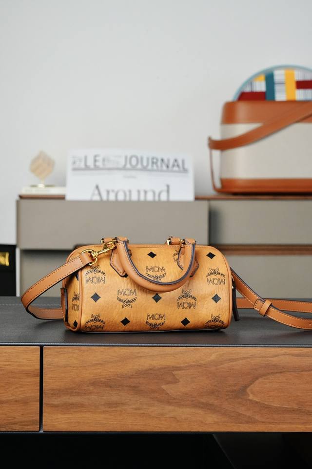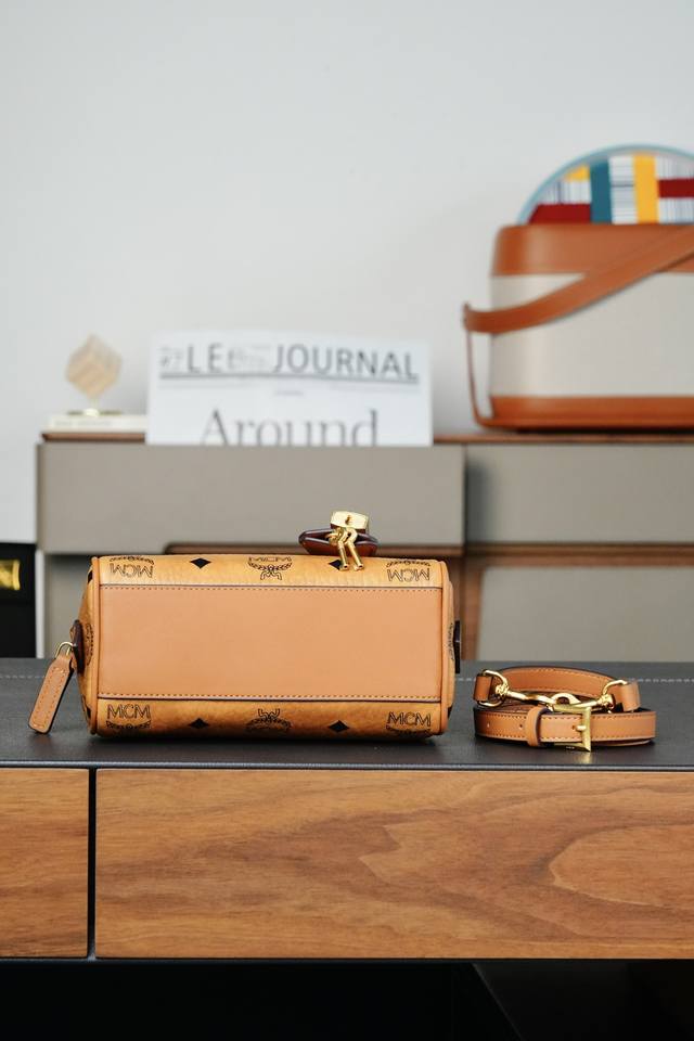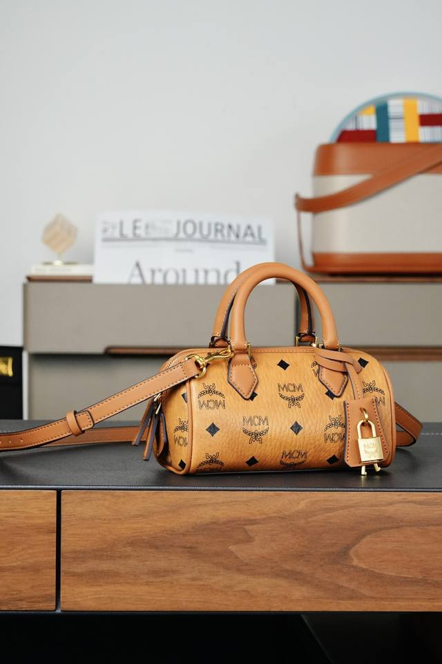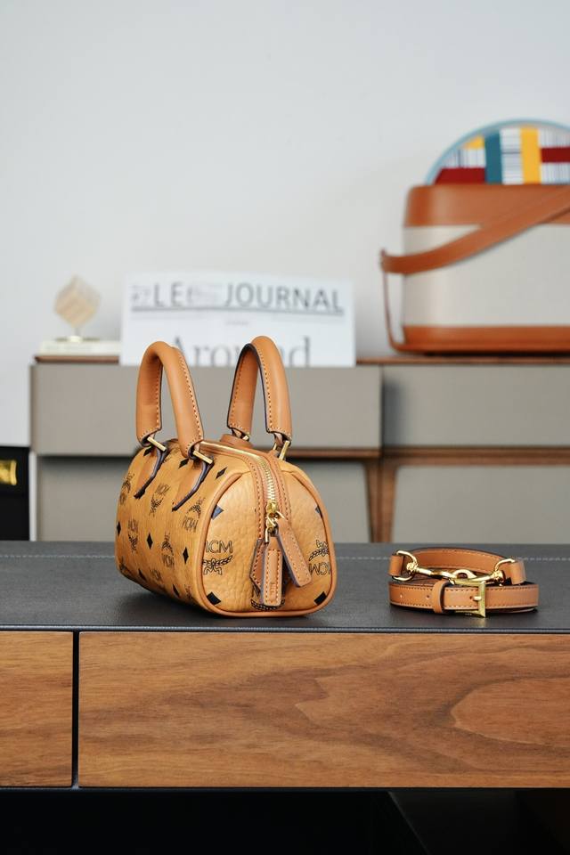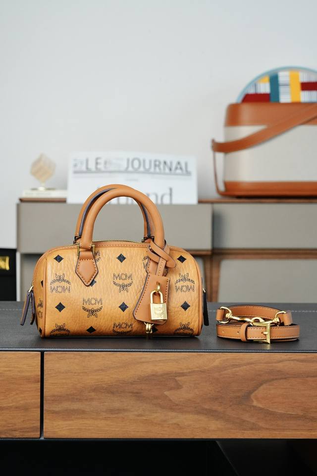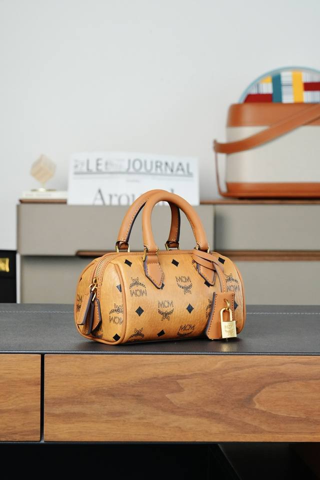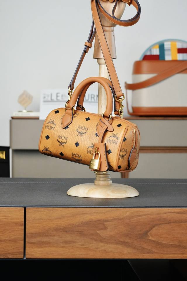 Visetos Boston bag features natural Nappa leather trim, leather tag, and padlock design. Born in Munich's Golden Age, this mini Ella Boston bag is an everyday shoulder bag. The leather tag and engraved logo metal padlock are inspired by the brand's travel tradition and are directly based on the brand's classic suitcases.