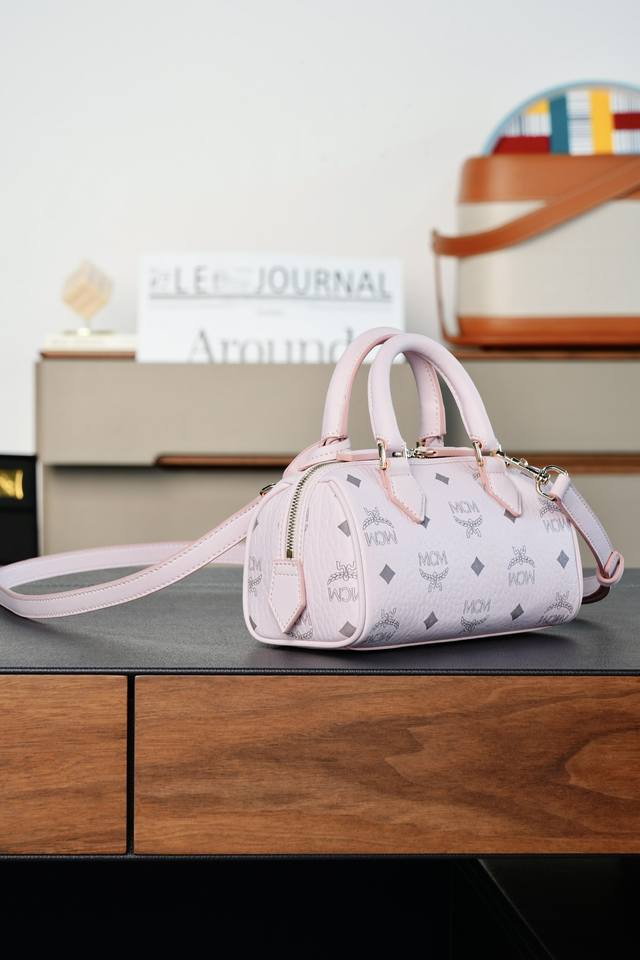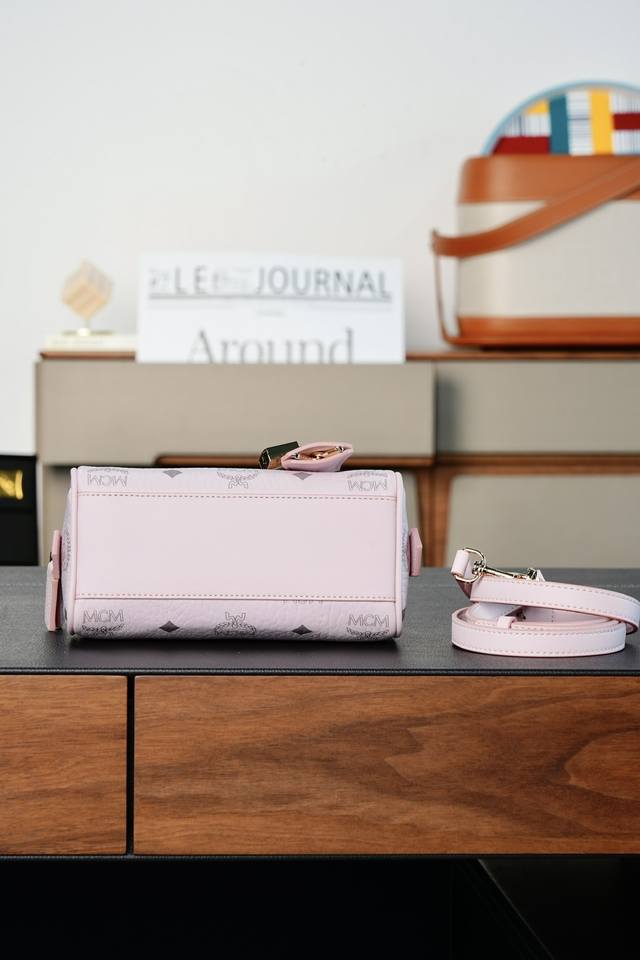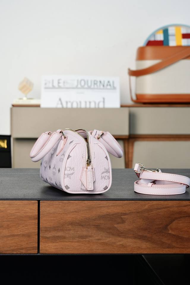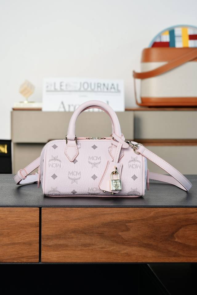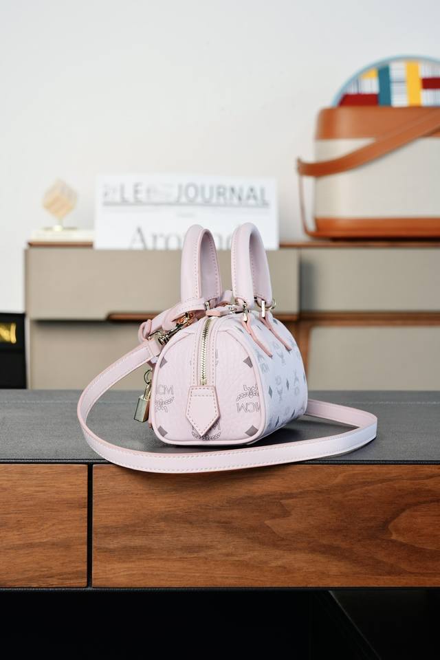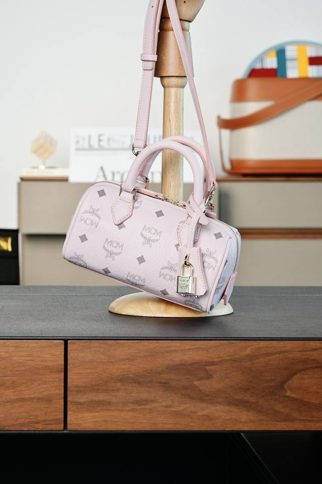 This mini Ella Boston bag, designed in pale pink, is a high-end travel bag born during Munich's Golden Age. Its design draws inspiration from classic suitcases of the era, retaining the travel elements of the leather tag and engraved metal padlock.