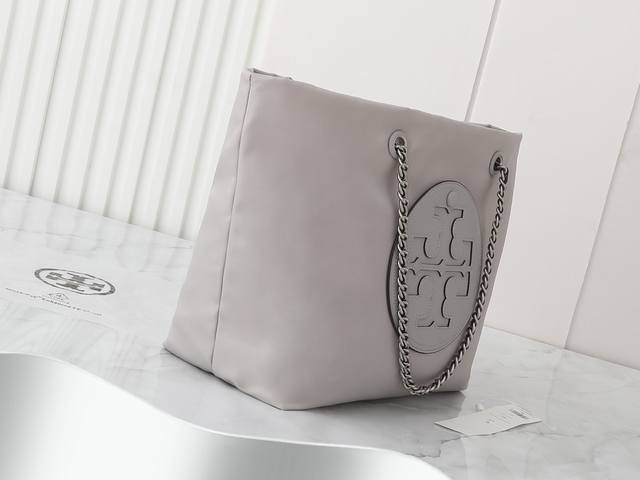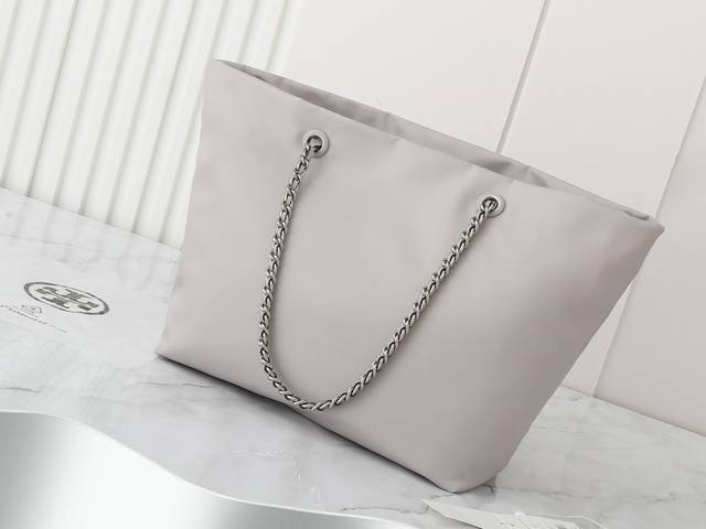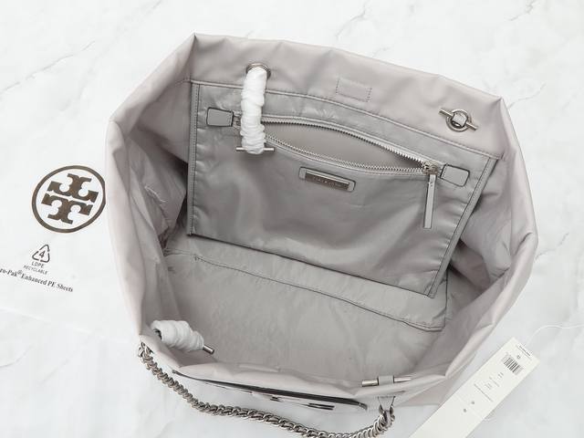 Original quality nylon fabric series, new product, pay attention to details. Tory Burch Ella chain tote bag, softly deconstructed, is uniquely identified by its lightweight recycled nylon material and woven chain shoulder strap. The spacious interior can accommodate everyday essentials, including a laptop, making it ideal for both daily use and travel. Dimensions: 29cm*32cm*16cm. Comes with hangtag sticker, counterfeit label, plastic bag, and branded paper.