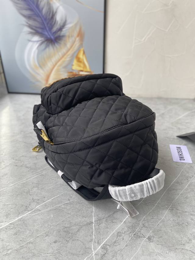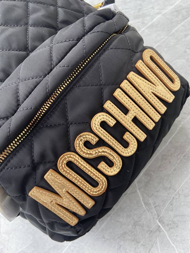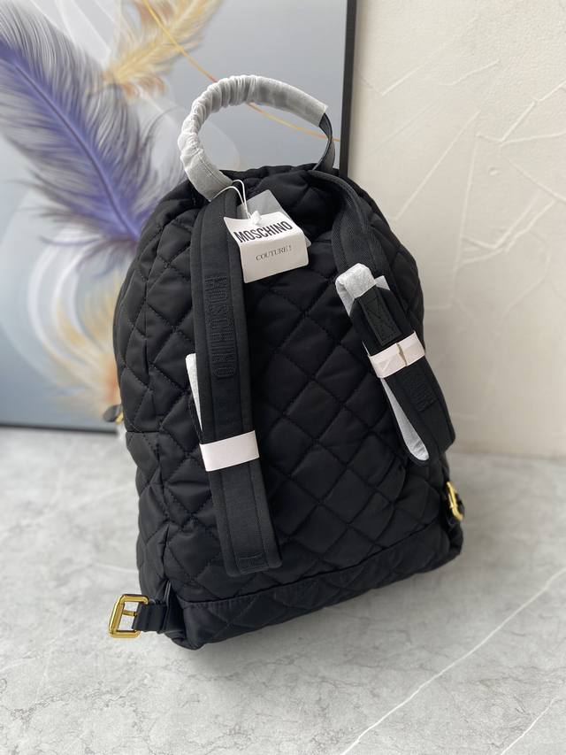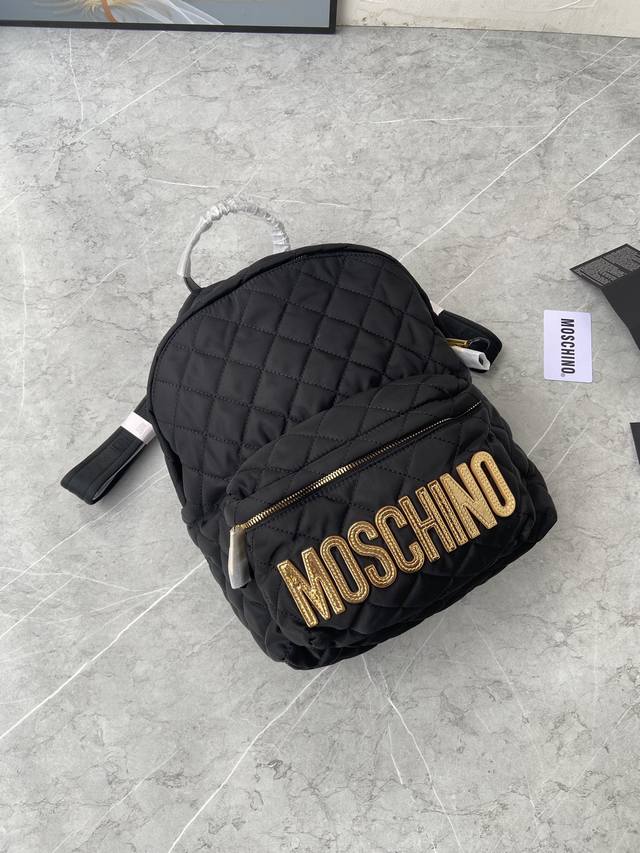 Original Single Item, High-Volume Sale, Mini Size, Large Size, New Color from Italian Boutique, Moschino Hot Selling Quilted Backpack, Moschino backpack features a simple and stylish design with micro-logo lettering, a two-way zipper, soft satin lining, super soft to the touch, hand-studded lettering, snowflake hardware, and shoulder straps made of pure cotton webbing. Large Size: Length 29cm, Height 38cm, Width 12cm; Small Size: Length 24cm, Height 28cm, Width 10cm; Mini Size: Length 15cm, Height 18cm, Width 8cm.
