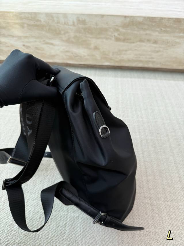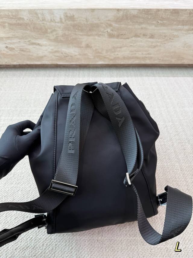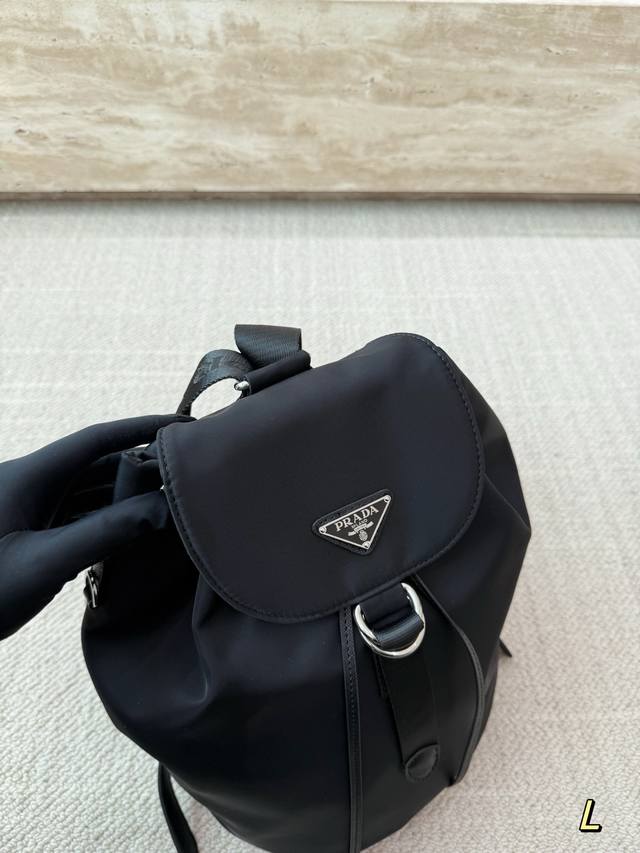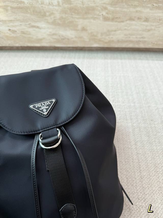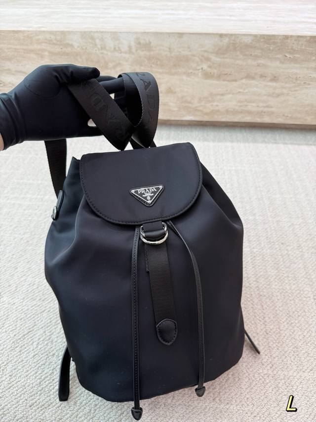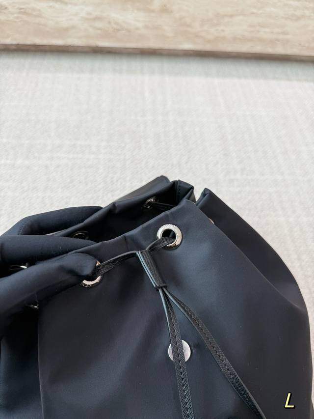 Prada Nylon Drawstring Backpack (Ddd) This Prada nylon drawstring backpack is made of classic black nylon, lightweight and durable, perfect for daily commutes or casual outings! The triangular silver logo on the front is highly recognizable. The drawstring and flap design makes it secure and easy to access your belongings. Measuring approximately 26.29cm, it can hold an iPad and other everyday items, making it both practical and stylish! The nylon material is easy to clean and waterproof, making it suitable for outdoor activities as well. It's very popular in the vintage market, combining fashion and functionality