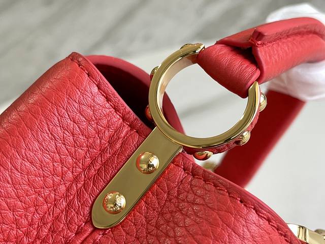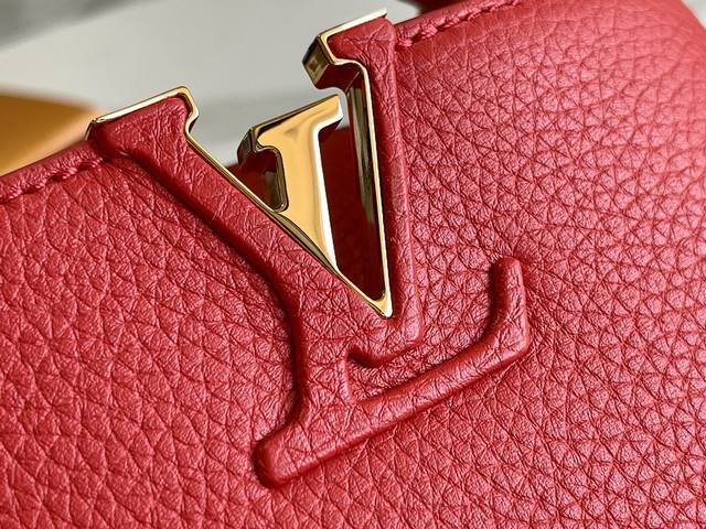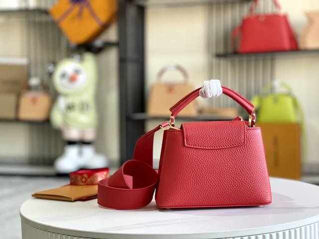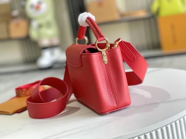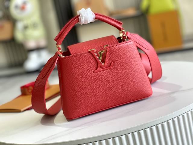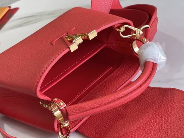 Premium, comes with a complete packaging set. Chip version. Premium original leather. M56071 M55985. Red gold buckle. This Capucines mini handbag showcases the subtle luster of fine Taurillon leather and is embellished with the signature lettering. The cleverly detachable wide shoulder strap allows the compact size to be carried over the shoulder or crossbody. Dimensions: 21.0 x 14.0 x 8.0 cm.