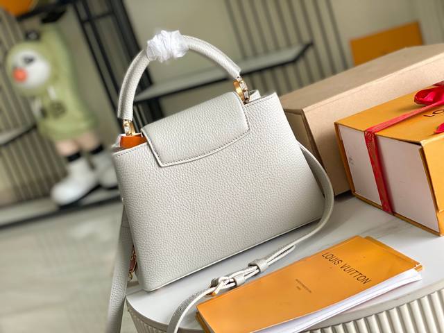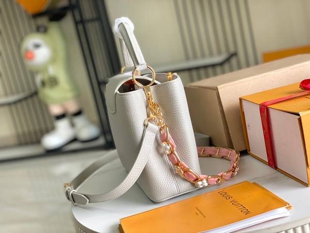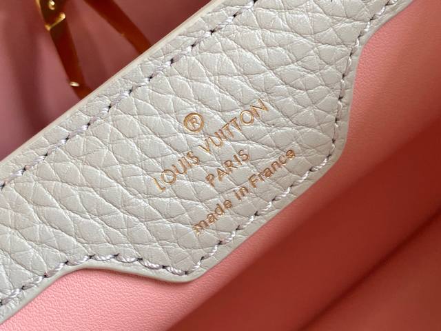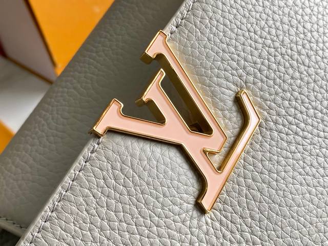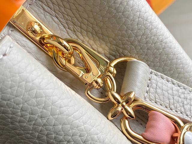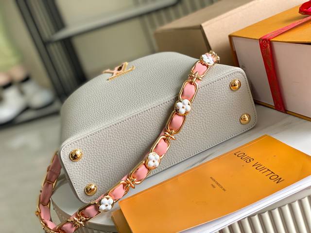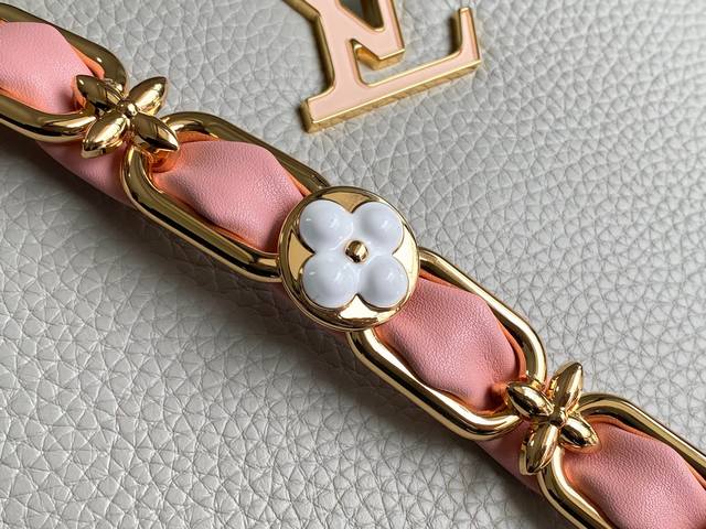 This season's new Capucines Bb handbag embodies femininity. Metal links and elegant, soft cowhide leather are woven into an exquisite chain, embellished with enamel and veneered Monogram flowers. The enamel brand logo adds a jewel-like quality, further enhancing the bag's beauty.