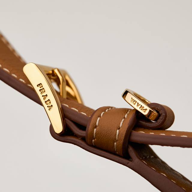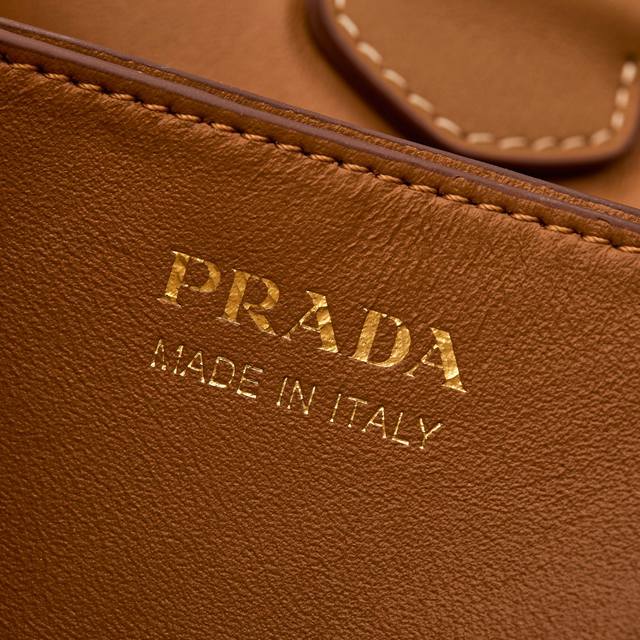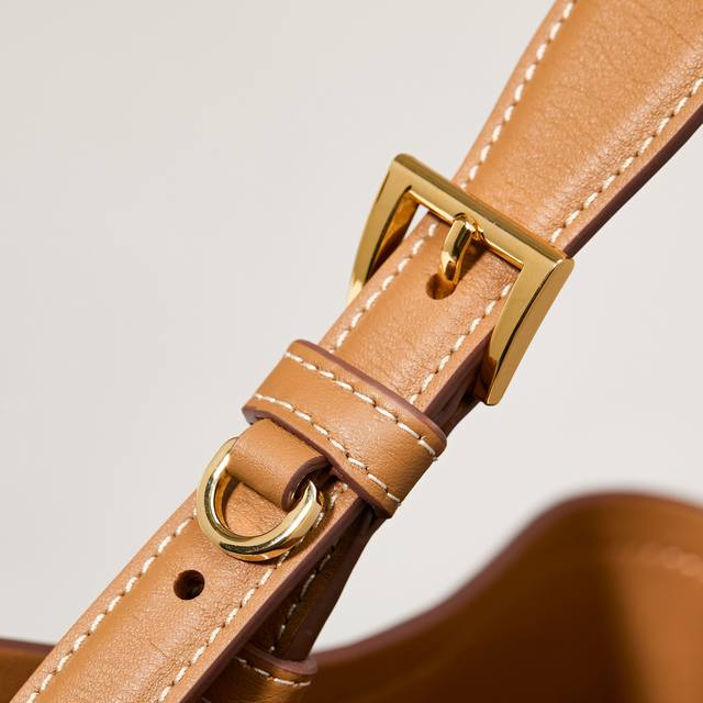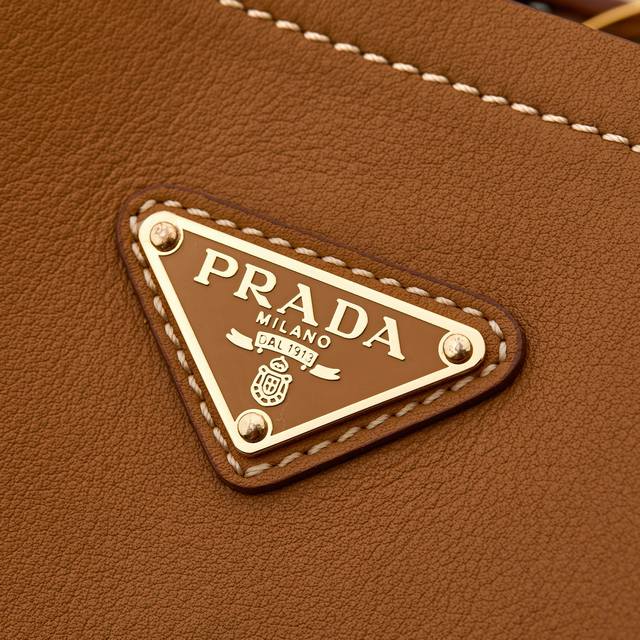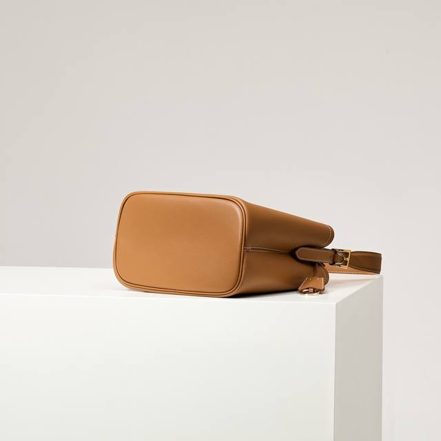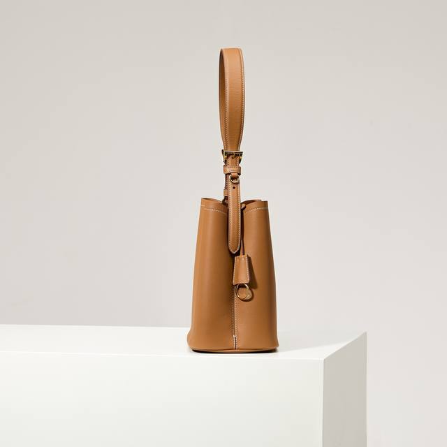 Premium Original Factory New Product 1Be080 Caramel Bucket Bag. This leather handbag boasts soft lines and exquisite design, highlighting classic style and handcrafted details. Practical and versatile, it features an enamel triangular metal logo for added recognizability. It has leather handles, 28cm long, a detachable key ring, metal hardware, an enamel triangular metal logo on the front, magnetic closure, and a large capacity. Grab yours now! Dimensions: Length 21.5 x Height 22.5 x Base 13cm.