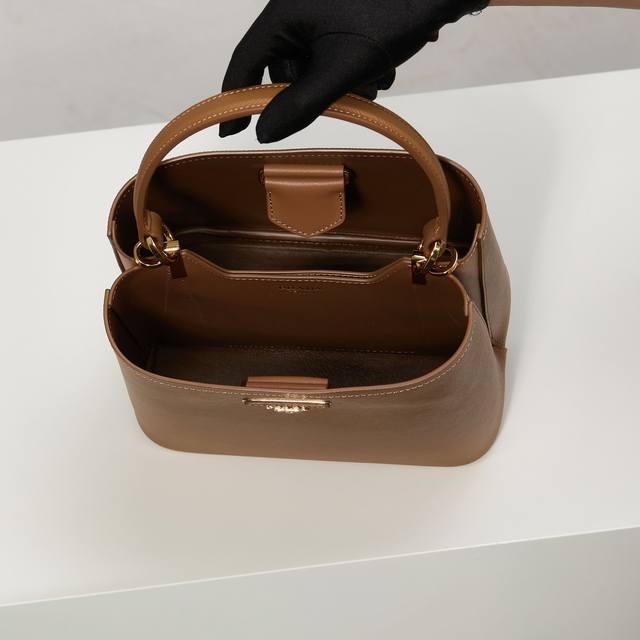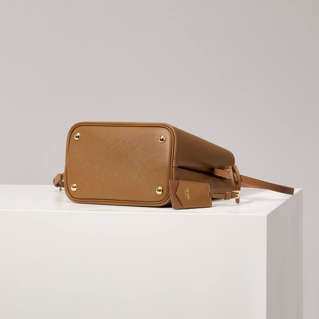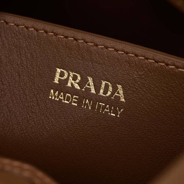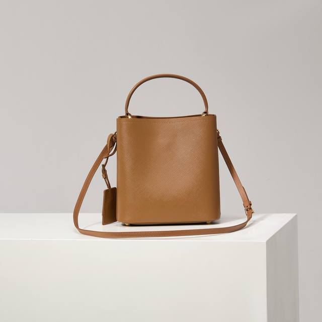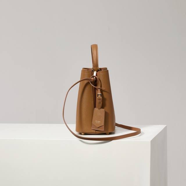 Premium Original Factory Newest Hot Selling Item 1Ba212 Caramel Caramel Lined Lambskin Bucket Bag with New Tag, Saffiano Leather Material, Detachable and Adjustable Leather Handles, Leather Shoulder Strap with Metal Logo, Detachable Leather Name Tag, Leather-Wrapped Magnetic Snap Closure, Central Opening, Saffiano Leather Triangle Logo, Contrasting Soft Lambskin Lining, Dimensions: 22