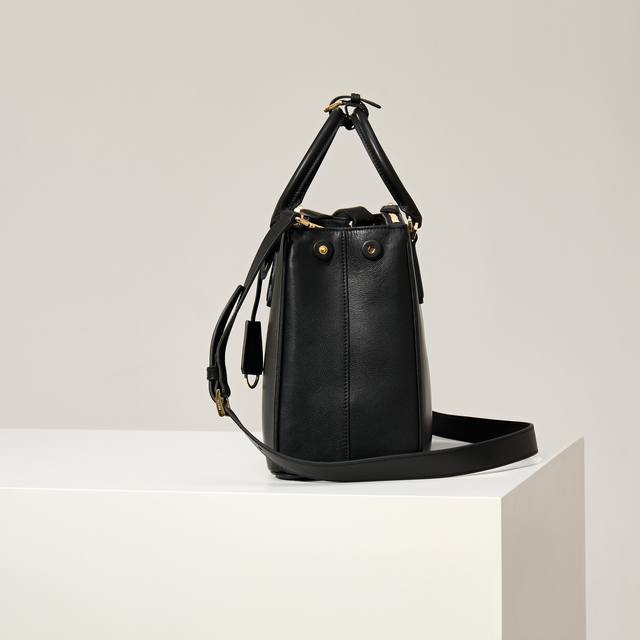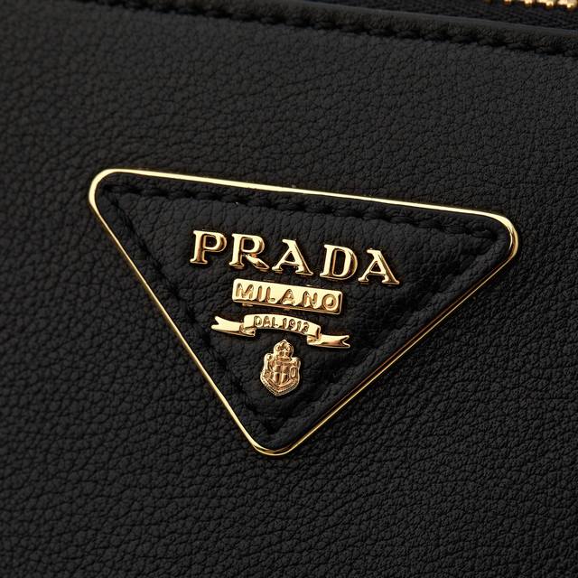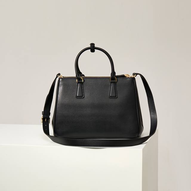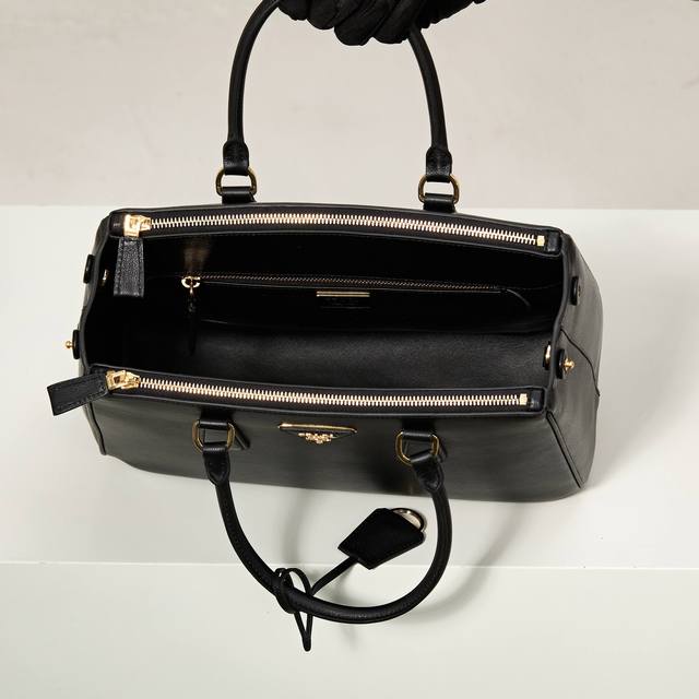 Premium Original Model: 1Ba274 New Black Plain Leather Saffiano Bag, Original Quality, Double Leather Handles, Detachable and Adjustable Leather Shoulder Strap, Gold-Plated Hardware, Detachable Leather Key Ring, Triangular Leather with Metal Engraved Logo, Side Snap Closure, Two Zippered Exterior Pockets, Three Interior Pockets (including one zippered pocket), Soft Lambskin Lining, Leather Feet, Authentic Code 165, Dimensions: 32