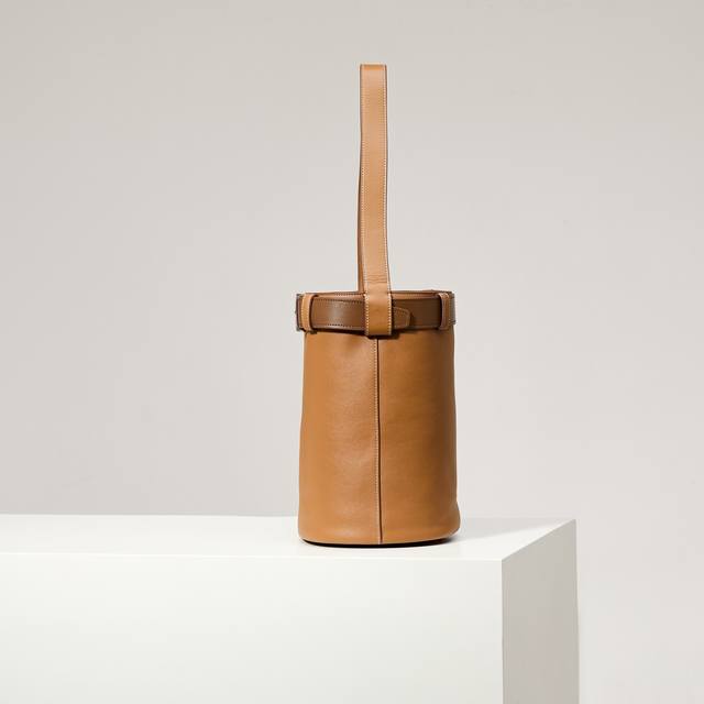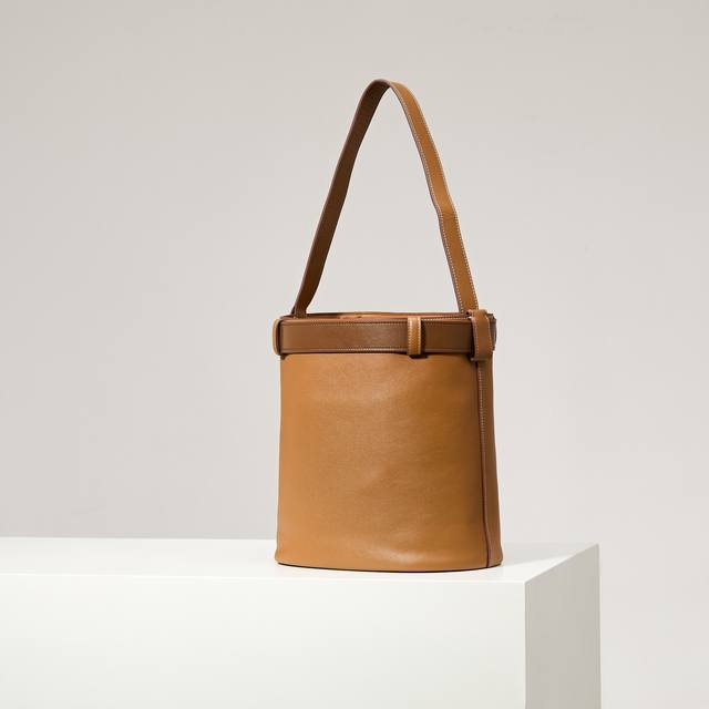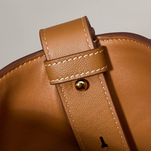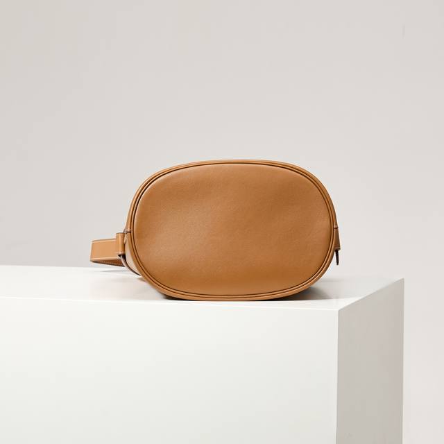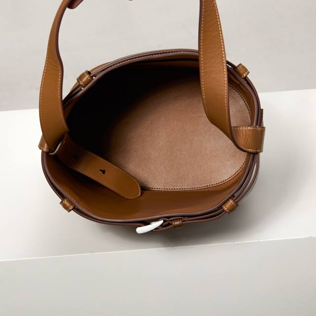 Premium Original New Bucket Bag 1Be085 Caramel. This stylish bucket bag offers a fresh take on the Buckle handbag silhouette, crafted from imported calfskin and imported lambskin lining. It features a leather strap with a detachable classic buckle for versatile styling. A perfect finishing touch to any modern look. Spacious, practical, and fashionable, grab yours now! Dimensions: Length 26.5 x Height 29 x Base 18 cm.
