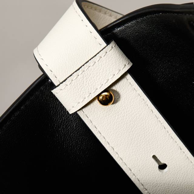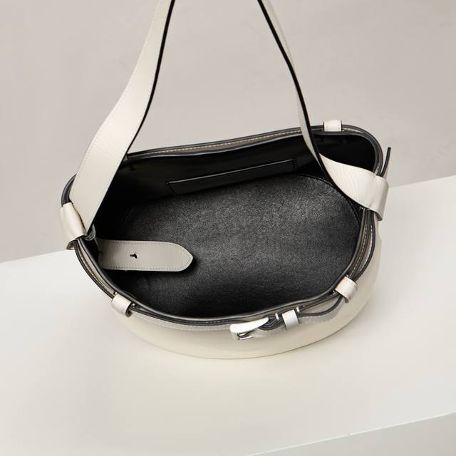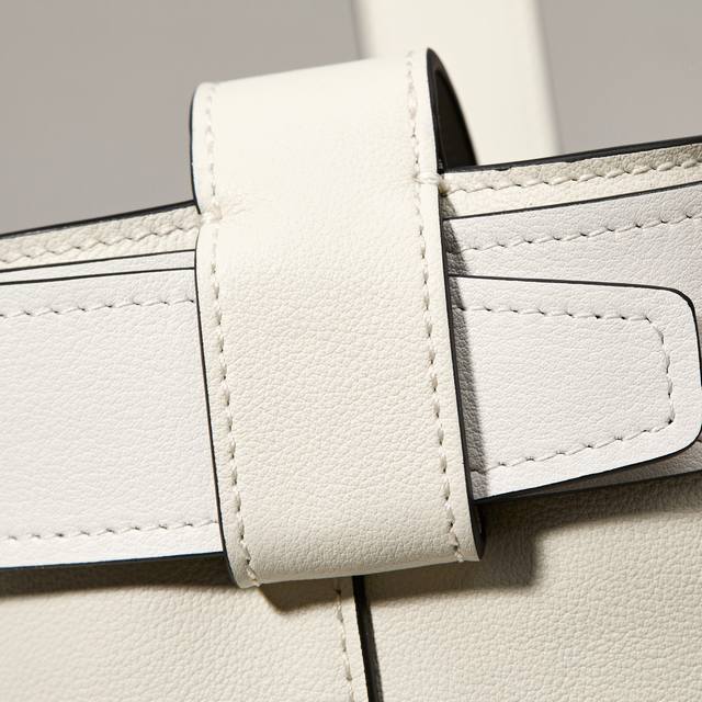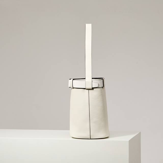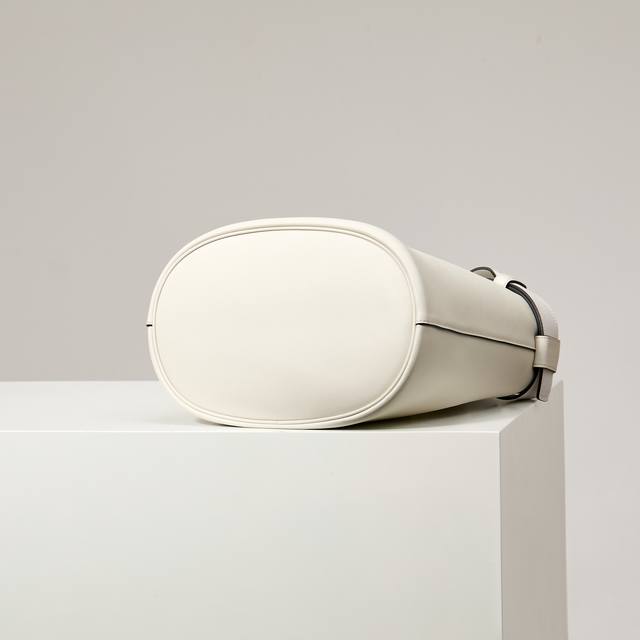 Premium Original New Bucket Bag 1Be085 White. This stylish bucket bag offers a fresh take on the Buckle handbag silhouette, crafted from imported calfskin and imported lambskin lining. It features a leather strap with a detachable classic buckle for versatile styling. A perfect finishing touch to any modern look. Spacious, practical, and fashionable, grab yours now! Dimensions: Length 26.5 x Height 29 x Base 18 cm.