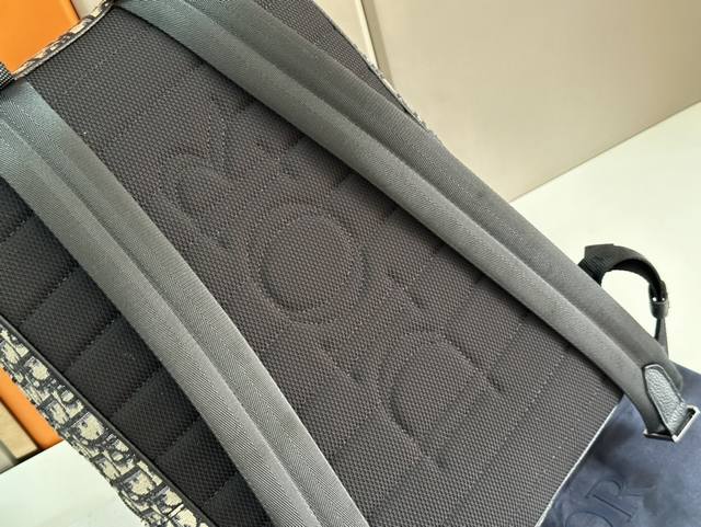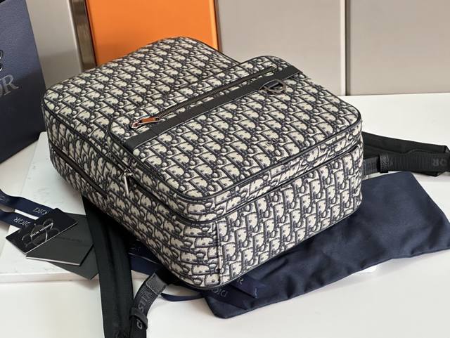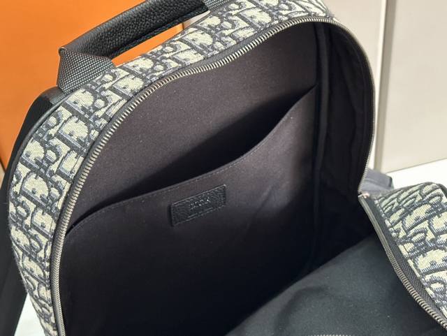 Premium Original. This Dio Explorer backpack draws inspiration from the principles of mountaineering, reinterpreted with a couture flair. Crafted from signature beige and black Oblique print fabric, it's accented with the Dio logo on the front for a touch of class. The flap features a zippered pocket, and the main compartment is spacious enough for everyday essentials. Side patch pockets keep a water bottle within easy reach. Its practicality makes it the perfect finishing touch to any casual look. Beige and black Oblique print. Brass 'Dio' logo on front. Side 'Dio' patch. Inside 'Dio' logo. 'Christian Dio' nylon jacquard strap. Buckle and drawstring closure. Adjustable 'Dio' quilted mesh strap. Nylon 'Christian Dio' jacquard top handle. Front zippered pocket and side patch pockets. Dust bag included. Made in Italy. Dimensions: 29 x 41 x 14 cm. Model No. 93378. Blue cloth. Main compartment fits a 15" laptop, documents, and tablet. Side pocket fits a 500ml water bottle.
