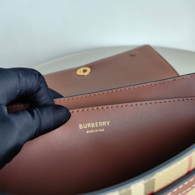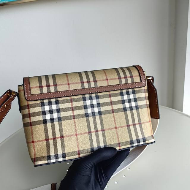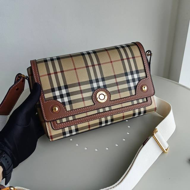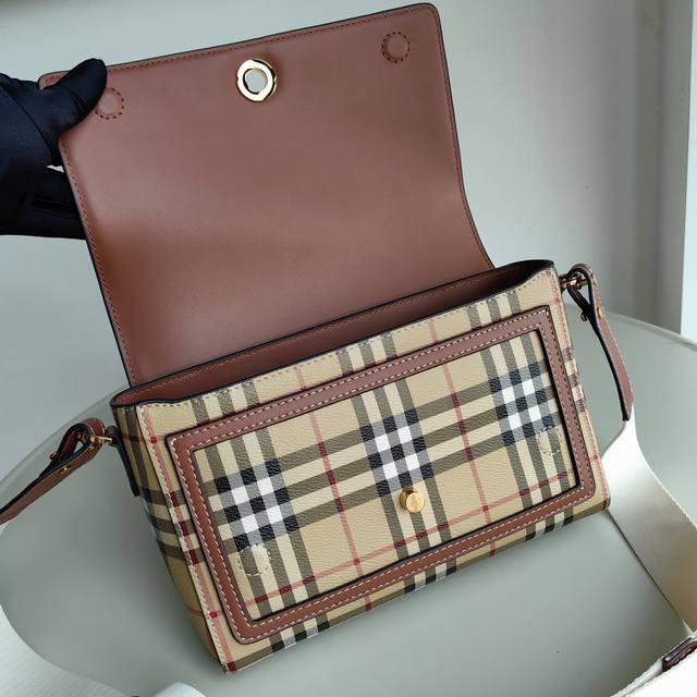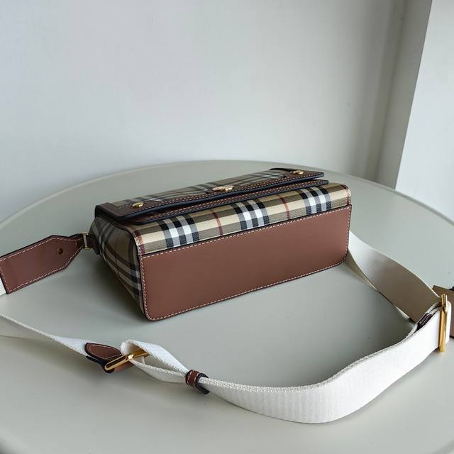 Premium version of this original leather B&Q Note bag, inspired by the brand's archives, featuring Bur check pattern and logo-engraved snap closures. Dimensions: 25 x 8.5 x 18 cm. Removable and adjustable crossbody strap. One exterior slip pocket; one interior slip pocket. Top flap with magnetic closure. Hand-painted edges. Glossy metal hardware.