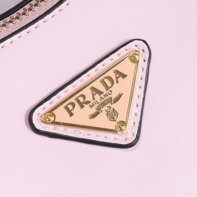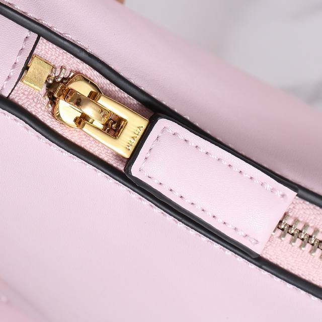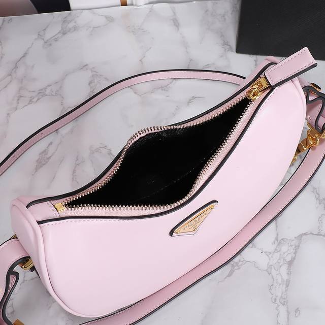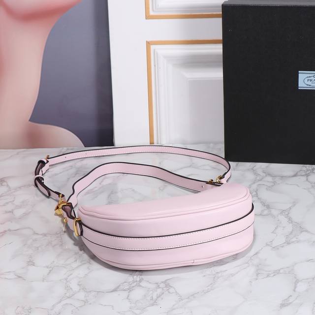 Returned stock with box, Prad A Moon Crescent Bag DDD. This season's dark horse, featuring calfskin and light gold color scheme, a crescent shape with a built-in adjustable clasp, and a chain threaded through the leather. It's versatile, showcasing elegance with a touch of retro charm. The side clasps instantly transform into a cute hula hoop, unlocking multiple uses for this bag. Dimensions: 24