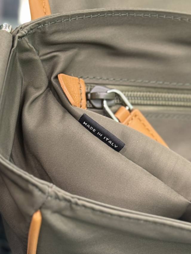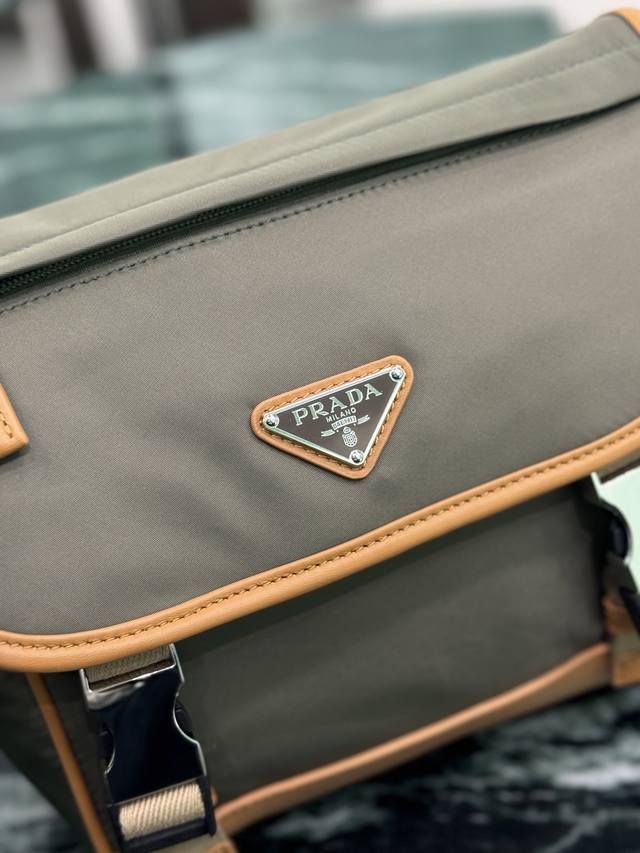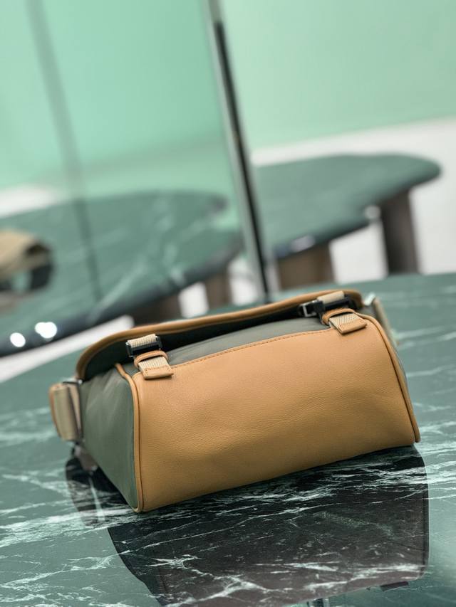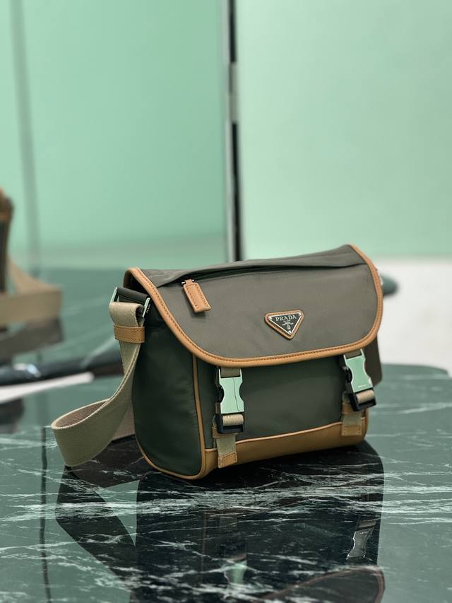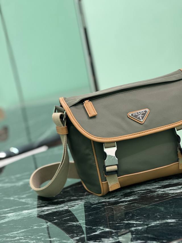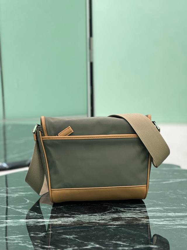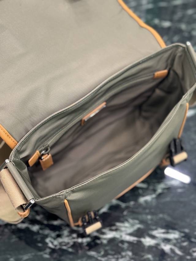 ) This messenger bag is designed with Re-Nylon recycled nylon fabric and contrasting calfskin leather. It features a flap and push-lock closure, three exterior zip pockets, an interior zip pocket, and a slip pocket. It boasts a large capacity and is a timeless and popular style. (