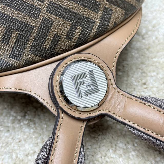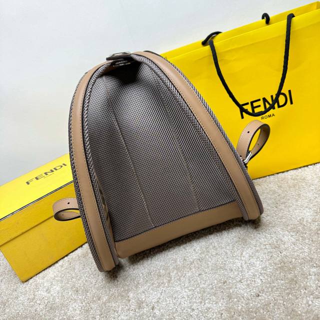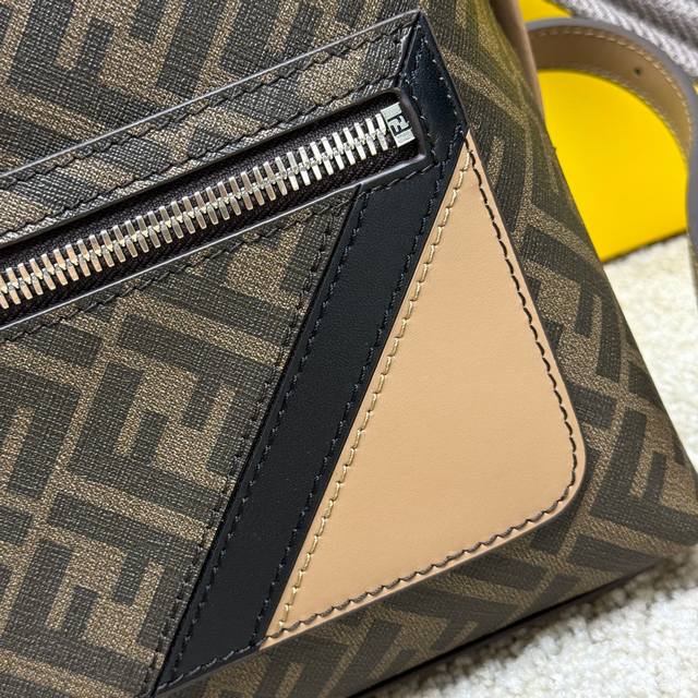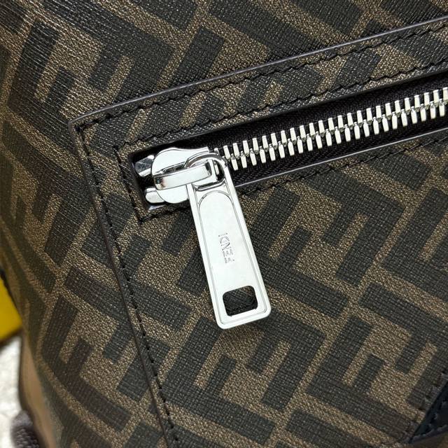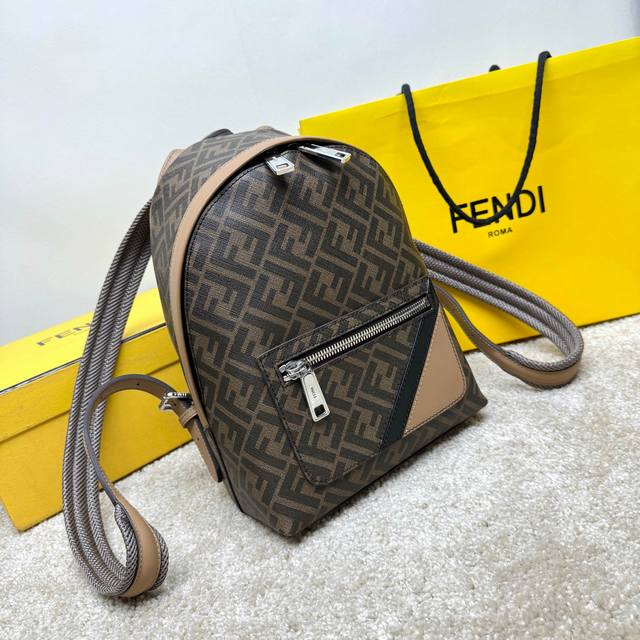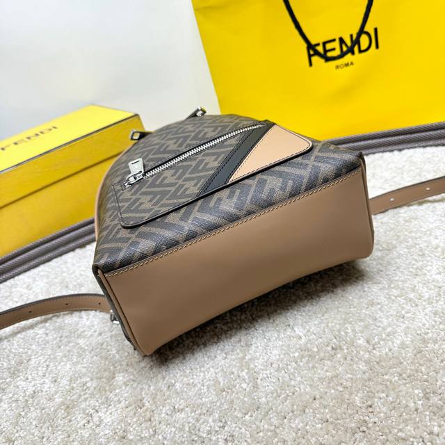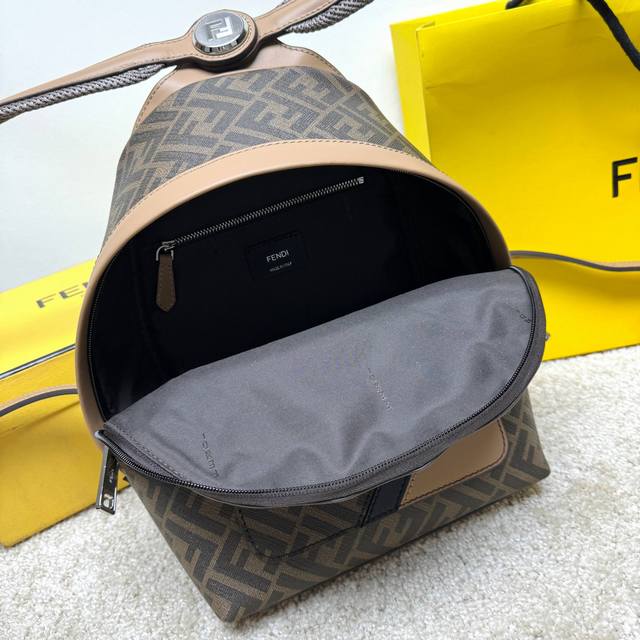 Small Structured Backpack. This design features a metal stud engraved with the Ff logo that allows the two shoulder straps to be combined into one, transforming it into a single-shoulder style. Made of brown Ff canvas with beige leather details. The front zip pocket is adorned with leather twill inlay. It includes a two-way zippered compartment, an internal zip pocket, and silver-tone hardware. The sliding adjustable shoulder strap allows this bag to be worn as a single shoulder or backpack. Dimensions: 36-24-12cm. Model: 7Vz077.