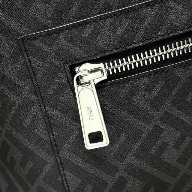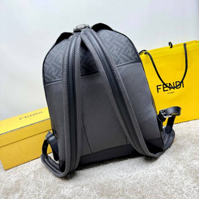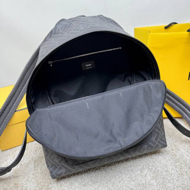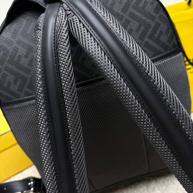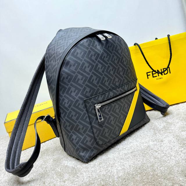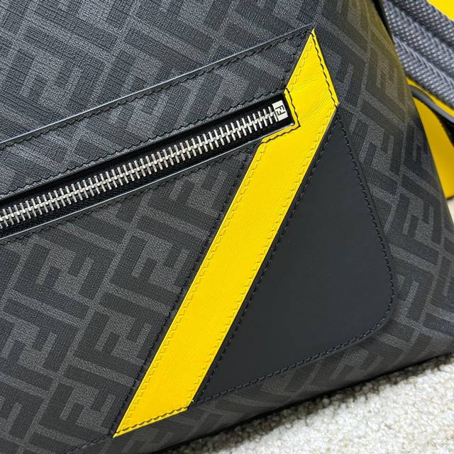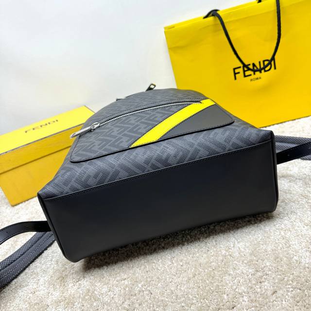 Structured Backpack. This design features a metal rivet engraved with the Ff logo, which converts the two shoulder straps into one, transforming it into a one-shoulder style. Made of black Ff canvas and black leather with diagonal yellow leather inserts. Features a two-way zipper compartment, an interior zipper pocket, and a padded back compartment for a 13-inch laptop. Silver-finish hardware.