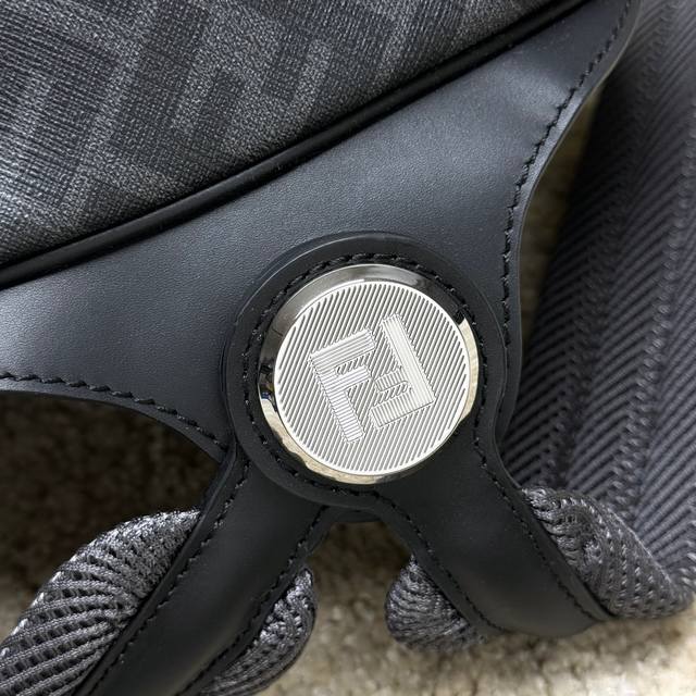 Structured Backpack. This design features a metal rivet engraved with the Ff lo