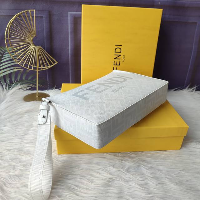 Style 7Va564 White silk-screen clutch with internal compartments, zipper closure, card holder and detachable webbing bracelet handle. Dimensions: 27cm-18cm-5cm