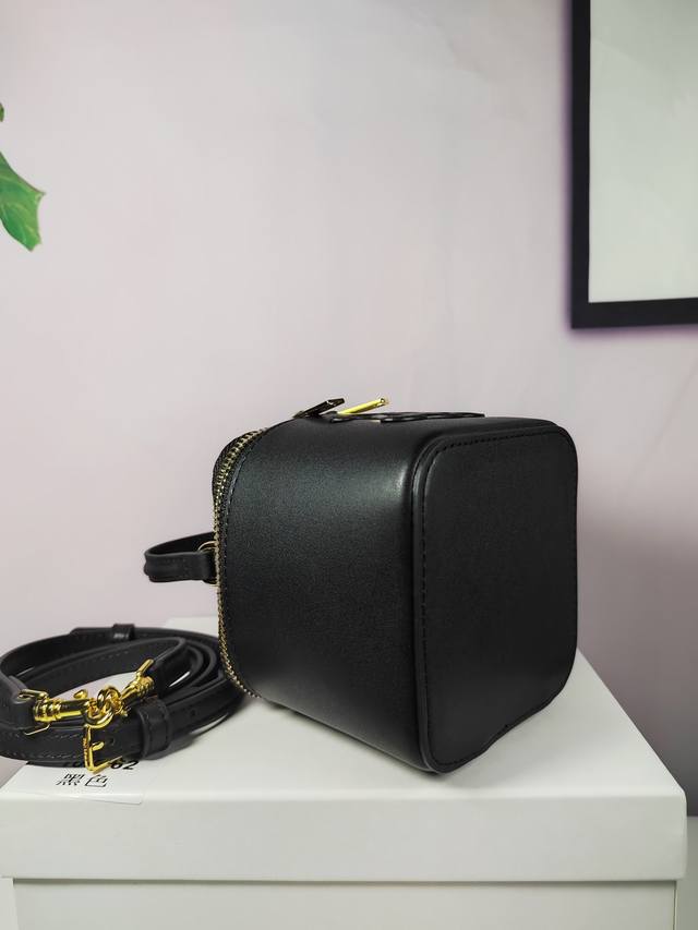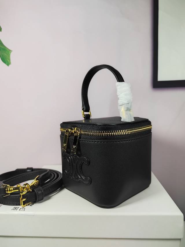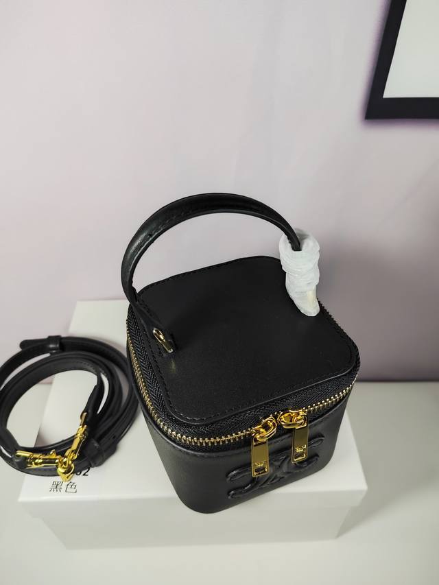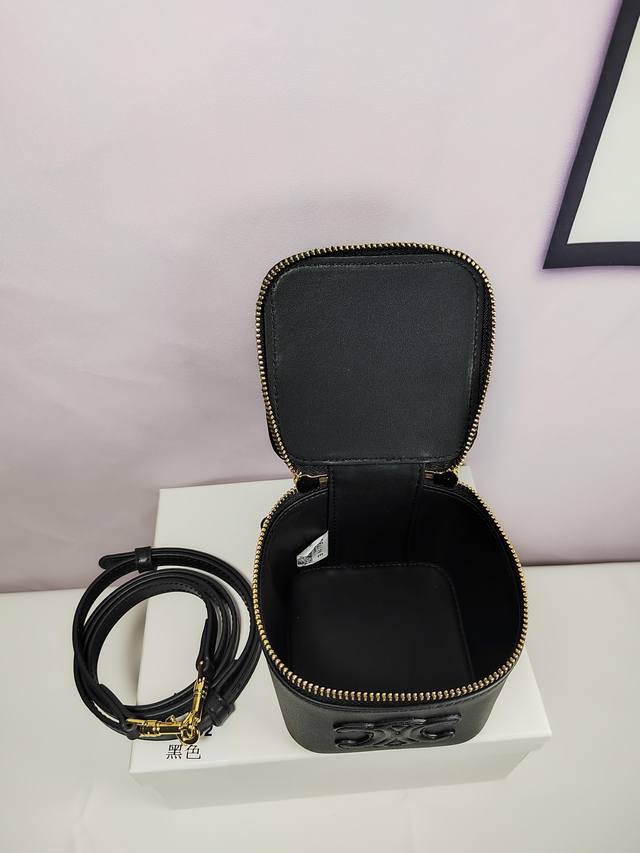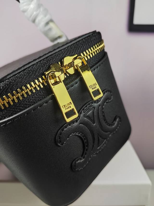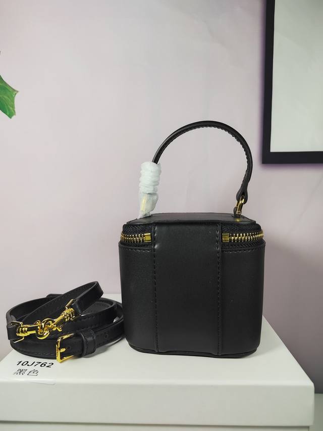 Style No. 10J762 Black, mini smooth cowhide cosmetic bag, zipper closure, adjustable and detachable shoulder strap, size 9.5Cm-8Cm-9Cm